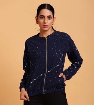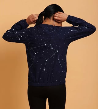 This blue bomber jacket can be teemed over a white skater dress or a light muted hued dress or top. This cotton bomber jacket is covered with embroidery patterns of Aquarius, Pisces, Scorpio and Taurus constellation and mirror work. The elastic sleeves on its edge and at the bottom of the jacket imparts it a nice-comfortable aesthetic and fit. Disclaimer: All other items in the image are only for display purposes and will not be a part of the delivery content. Product colour may slightly vary due to photographic lighting sources.