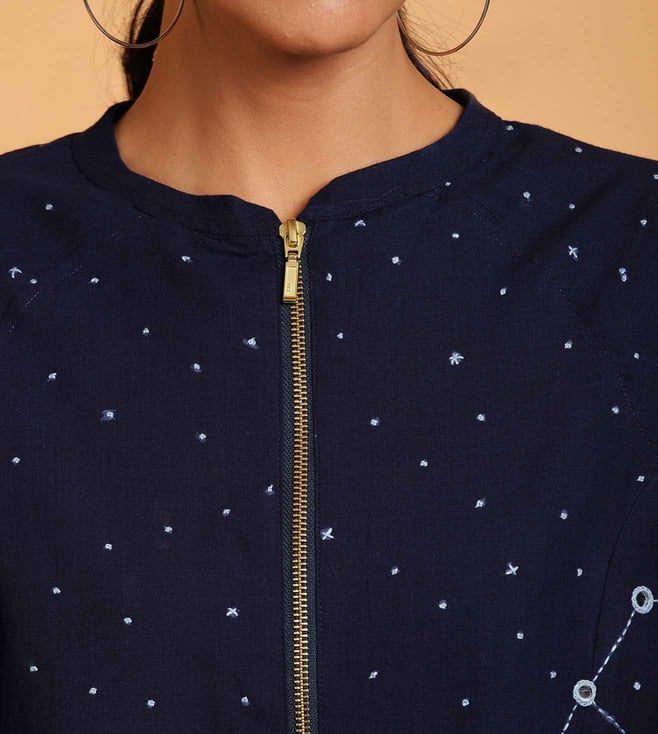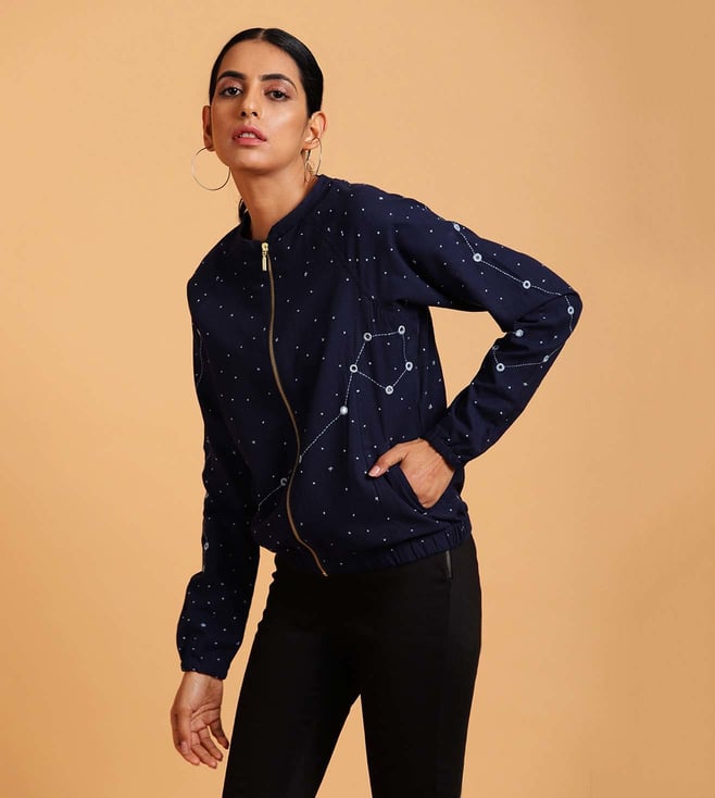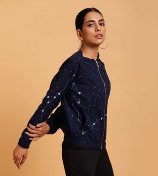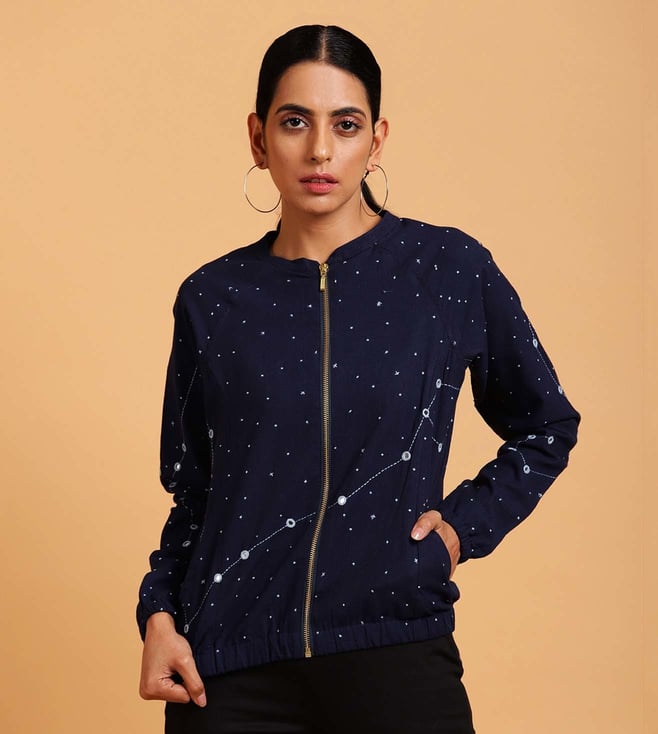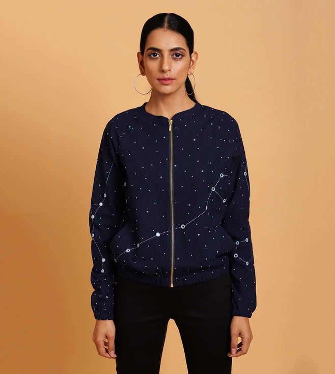 Okhai Festive Blue The Night Sky Moonlight Embroidered Cotton Bomber Jacket