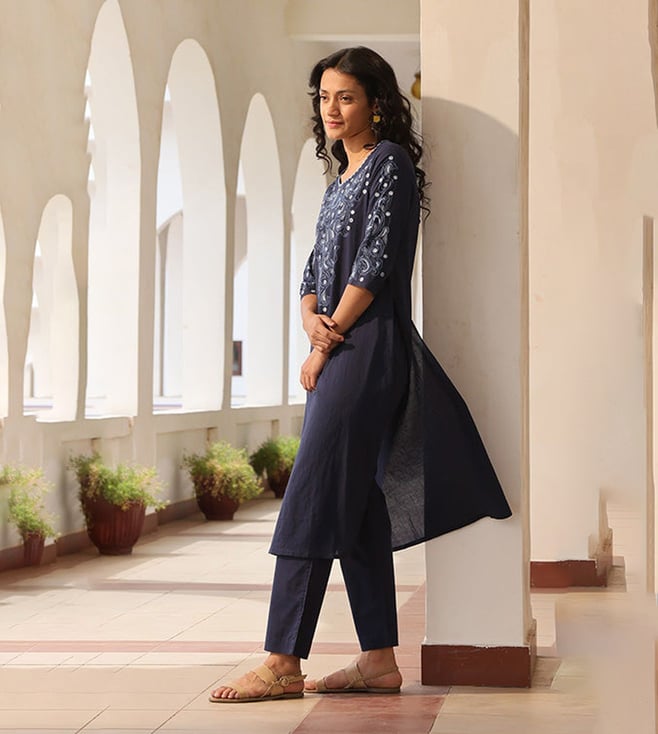 Okhai Festive Indigo General Mehfil Pure Cotton Hand Embroidered Mirrorwork Kurta With Pant