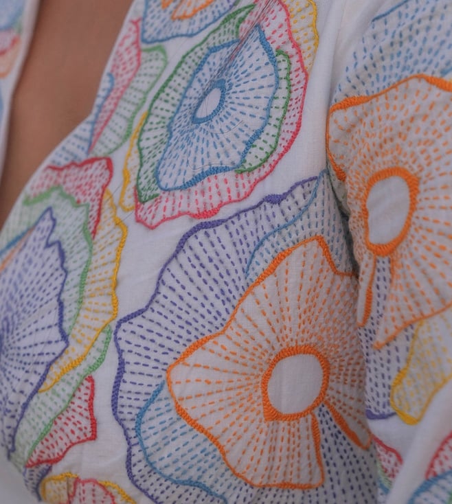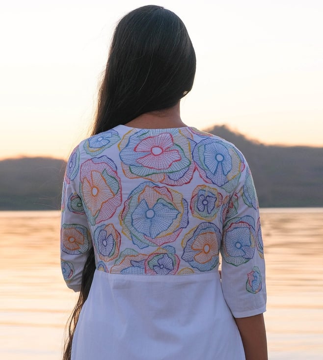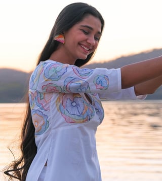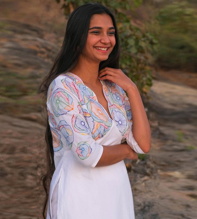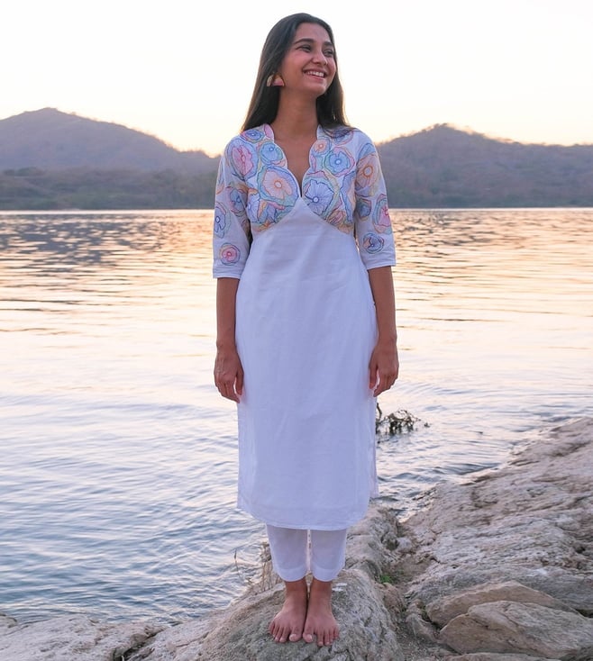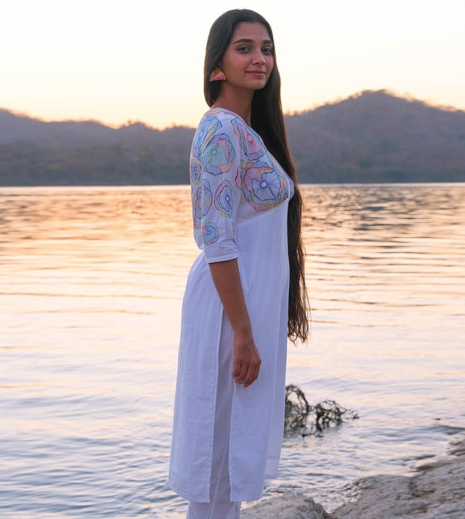 Okhai Festive White Narmada 2023 Swirl Pure Cotton Hand Embroidered Kurta with Pant