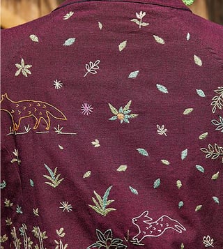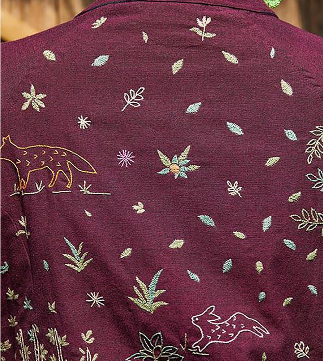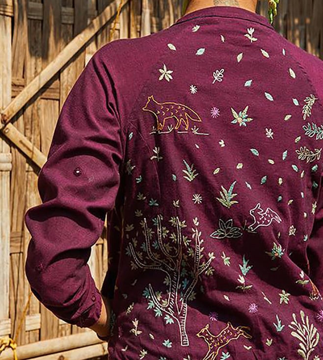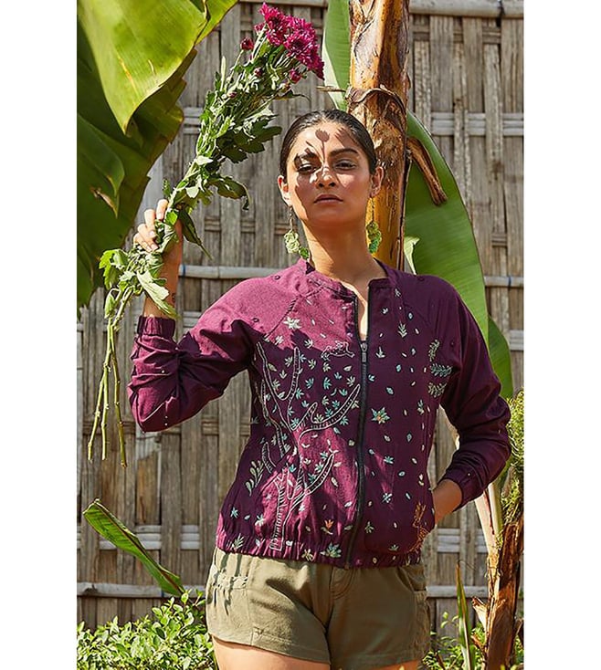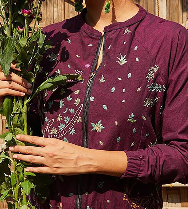 This exquisite work of art is called Night Forest wine jacket from Okhai Festive. Made from pure cotton fabric, this remarkable design is heavily decked with hand embroidery. The scene from a forest with animals and trees is made from a combination of satin, stem and running stitch. It has a sturdy functional zipper, elastic on the waist and the cuffs, and two pockets. Disclaimer: All other items in the image are only for display purposes and will not be a part of the delivery content. Product color may slightly vary due to photographic lighting sources.