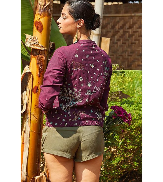 Okhai Festive Wine Hand Embroidered 'Night Forest' Bomber Jacket