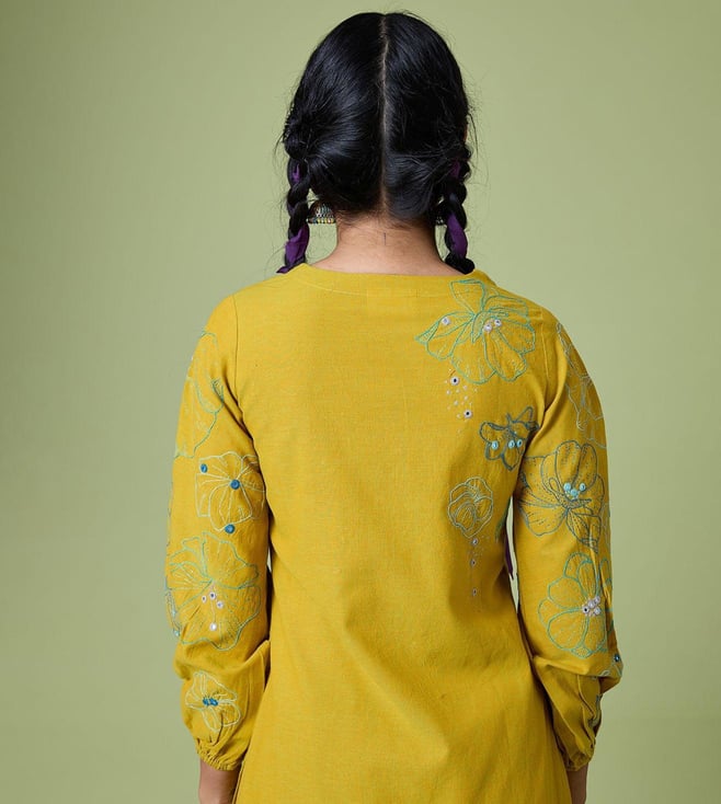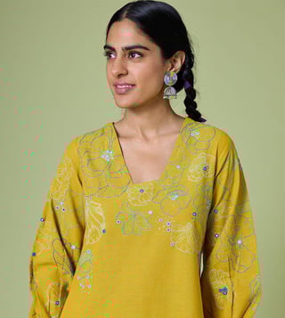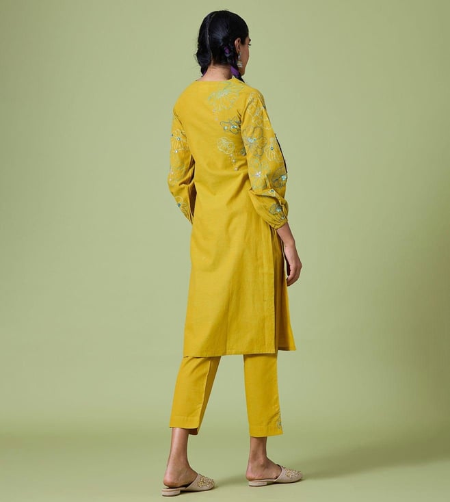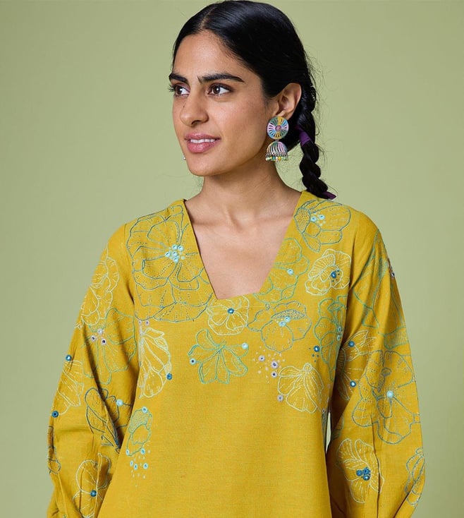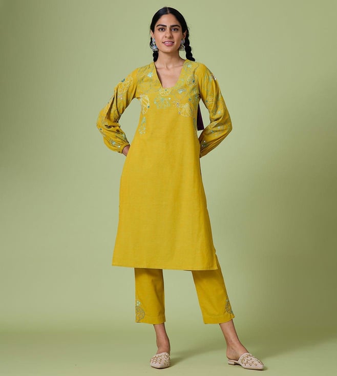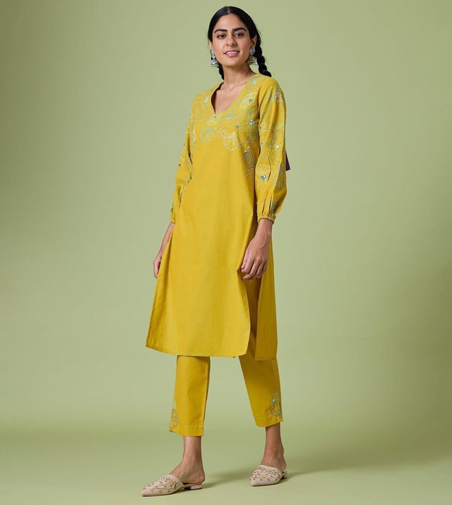 Okhai Festive Yellow Daisy Pure Cotton Hand Embroidered Mirror Work Kurta with Pant