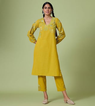 This kurta and pant set offers comfort and style that is flattering to all body types. The front yoke and sleeves have been intricately embroidered with the finest material while the pants have a motif at the bottom sides. For added glamour, the back of the kurta is also adorned with a lovely motif. The pants come with a drawstring, elastic and 2 pockets. Team it with earrings to compliment the look. It has been crafted using cotton. Disclaimer: Product colour may slightly vary due to photographic lighting sources. Country of Origin - India.
