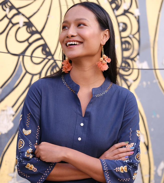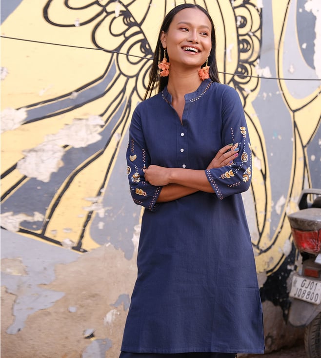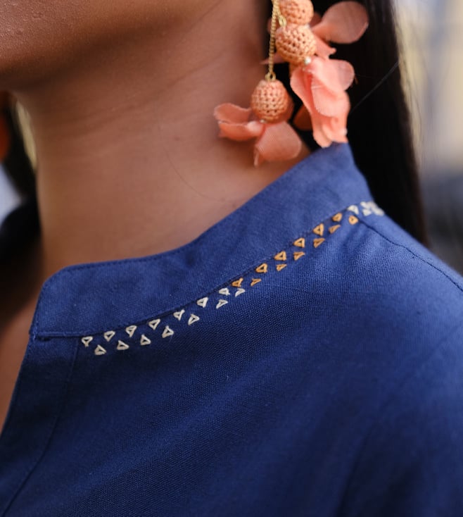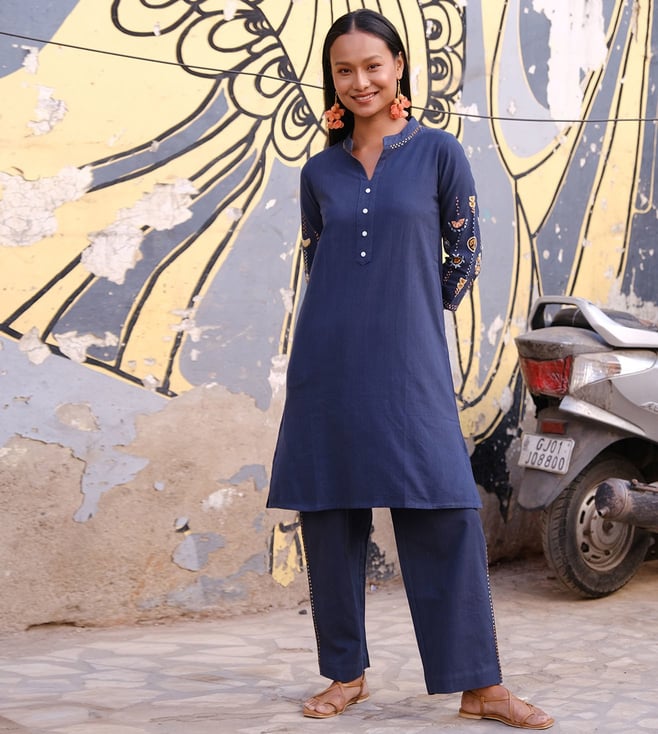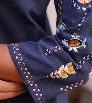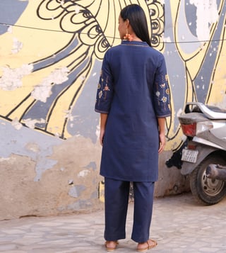 A citrus grove in motion¿Tangerine plays with the many faces of the fruit, from whole and ripe to sliced open, revealing its sunlit core. Suf embroidery maps out each detail, turning cotton into a canvas of zesty warmth. The kurta¿s easy fit keeps things light, the matching pants grounding it with quiet balance. Wear it with chunky silver, maybe a hint of kajal¿something about this set calls for a little mischief.