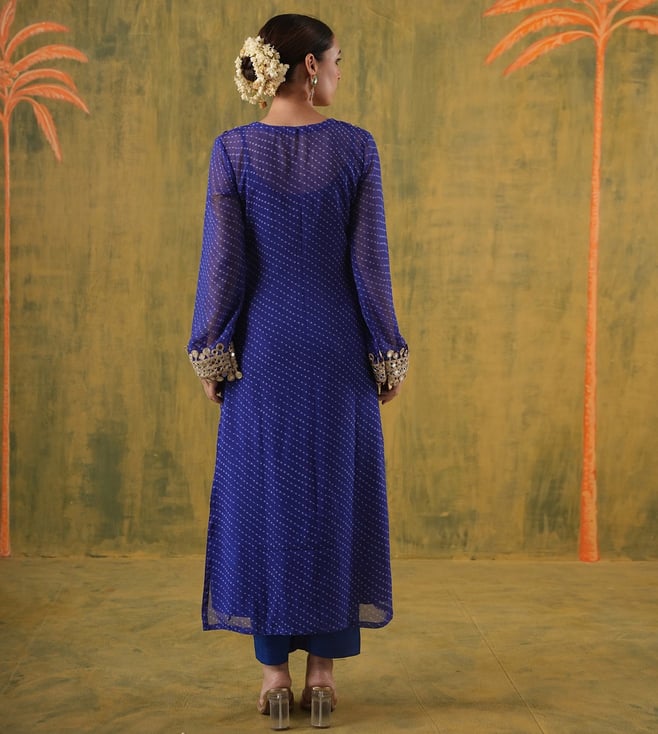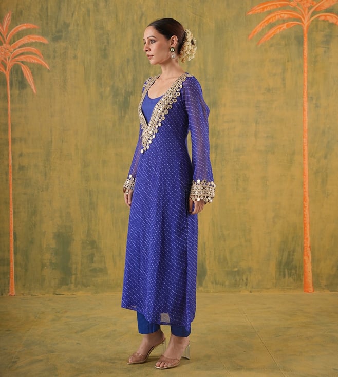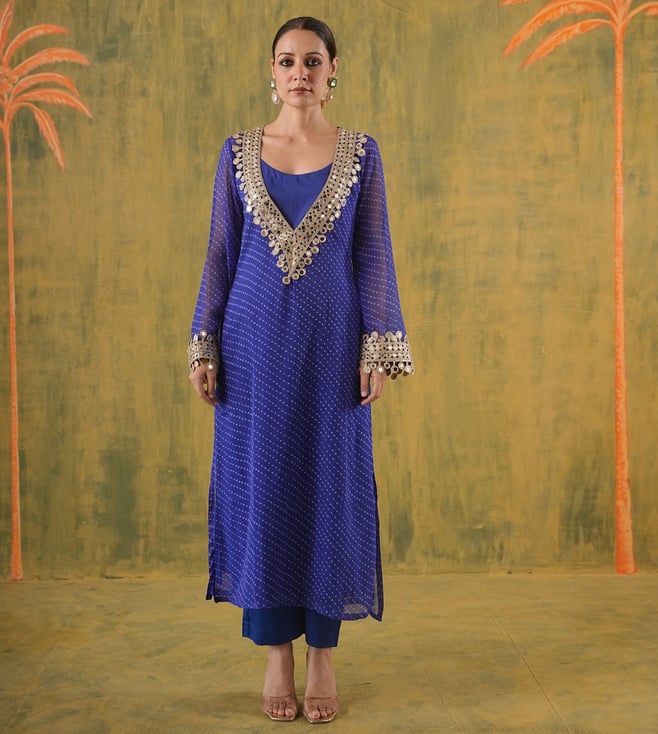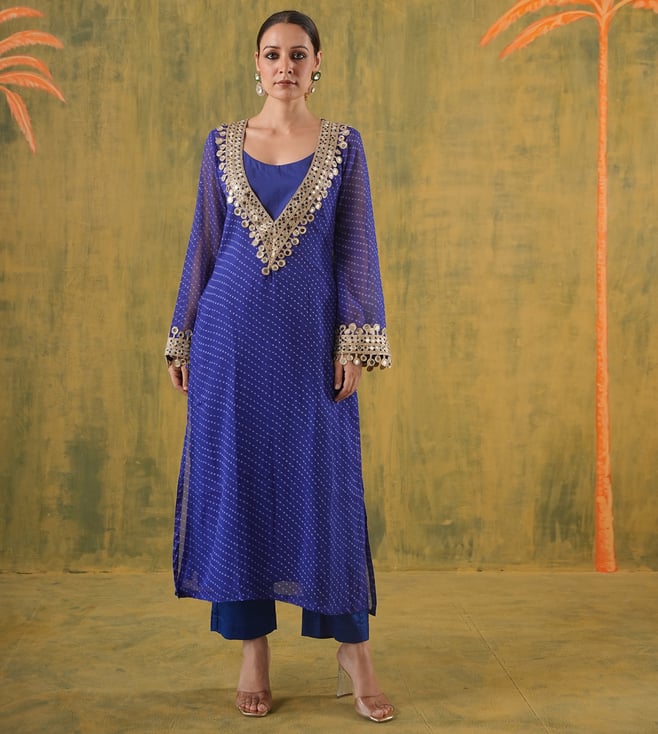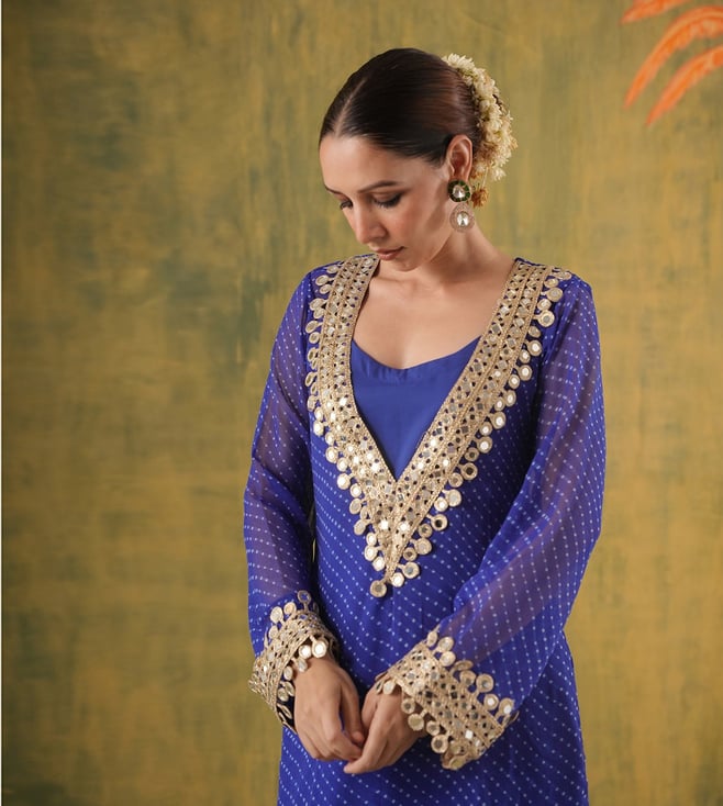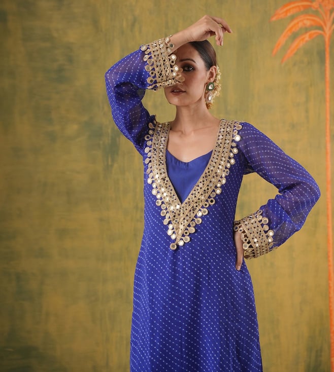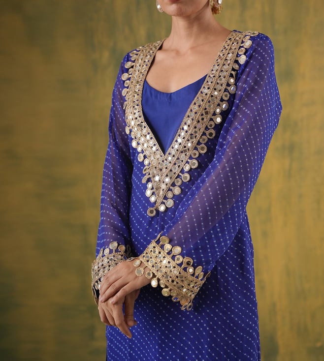 Step into a realm of midnight elegance with the Rani Meher Blue Mirror Suit Set a luminous nod to regal Rajasthani charm and modern grace. This striking ensemble features a flowy sheer kurta crafted in soft georgette, highlighted with embroidery and intricate mirrorwork around the deep V-neckline and sleeve hems, capturing the essence of timeless royalty.The kurta s dotted texture adds movement and depth, while the deep blue tonal pants provide a crisp silhouette and comfort.