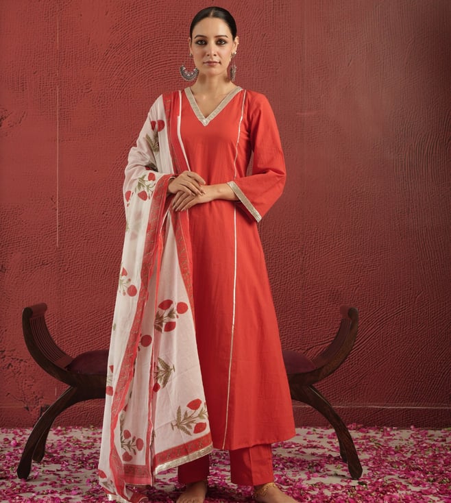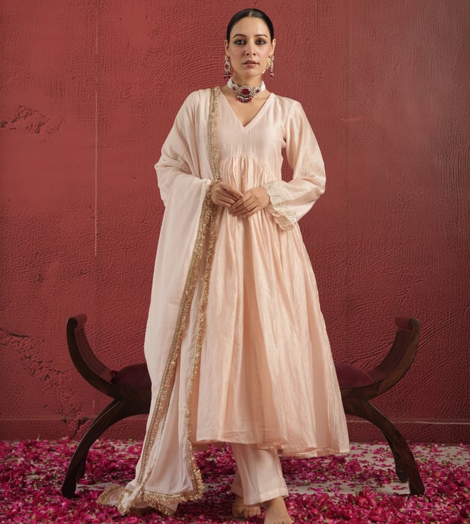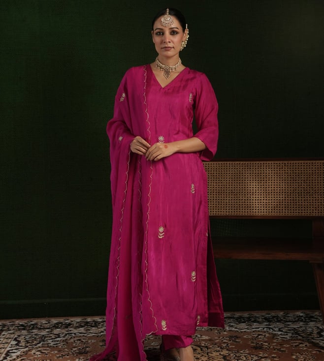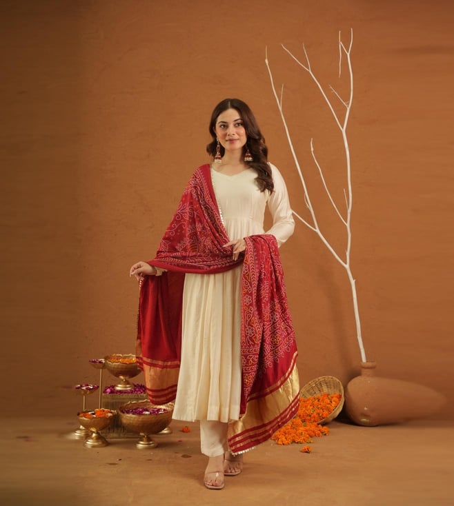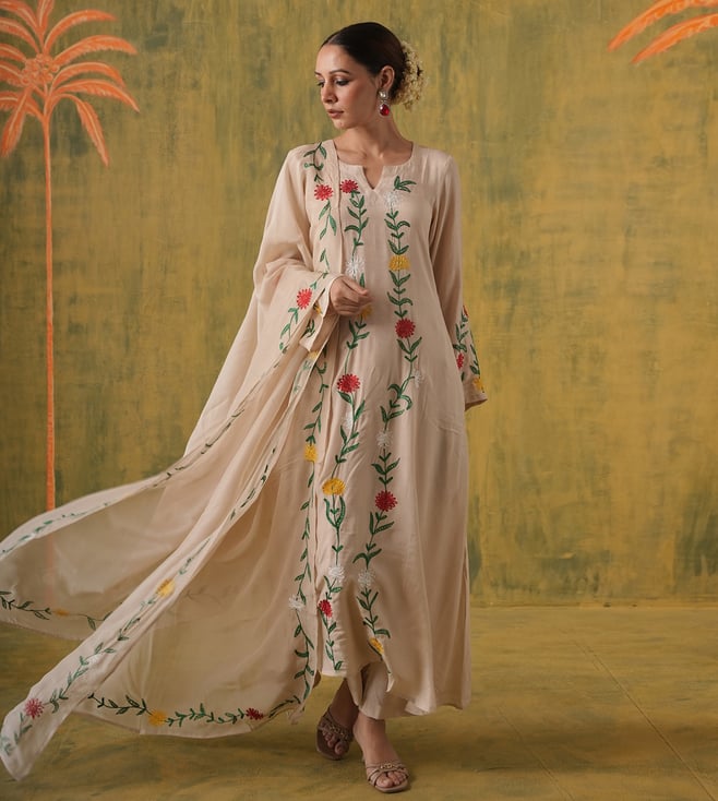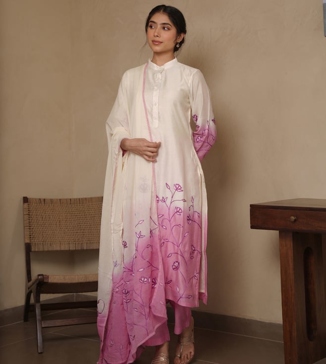 Off White Chanderi Embroidered Kurti With Pants And Dupatta Set