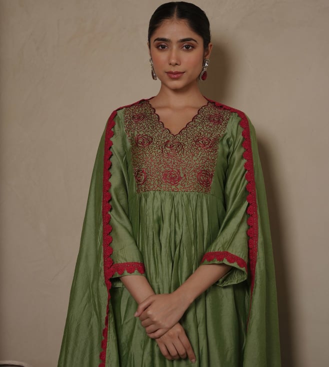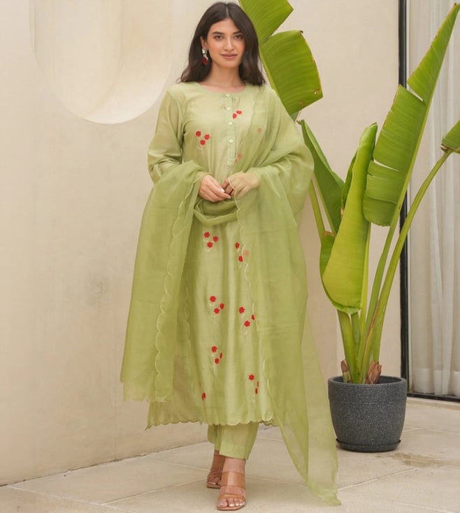 Bahaar Green Pista Chanderi Floral Embroidered Suit Set