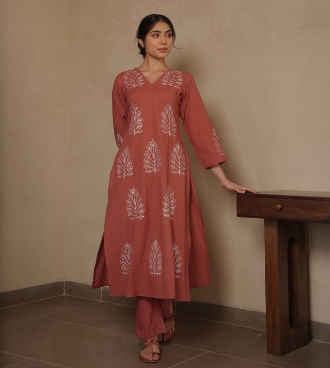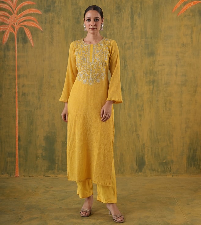 Onewe Mustard Cotton Relaxed Fit Embroidered Kurta Set