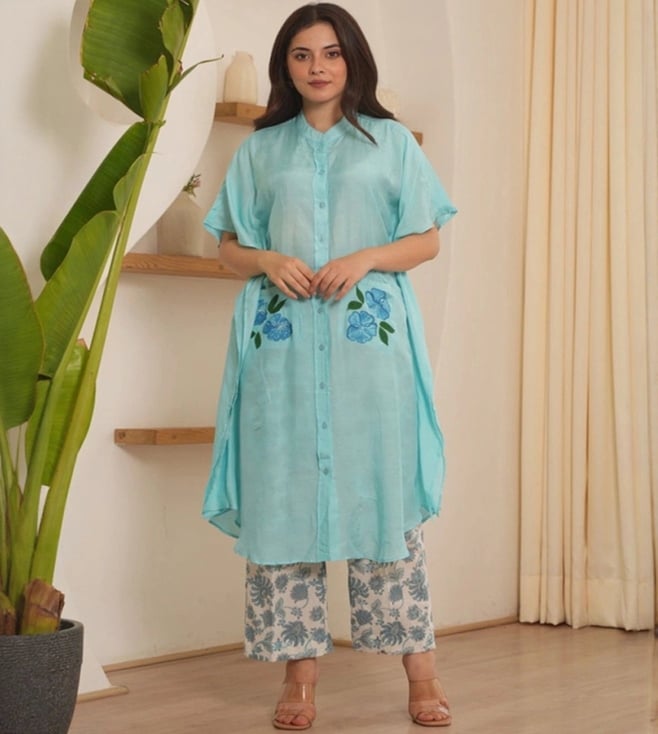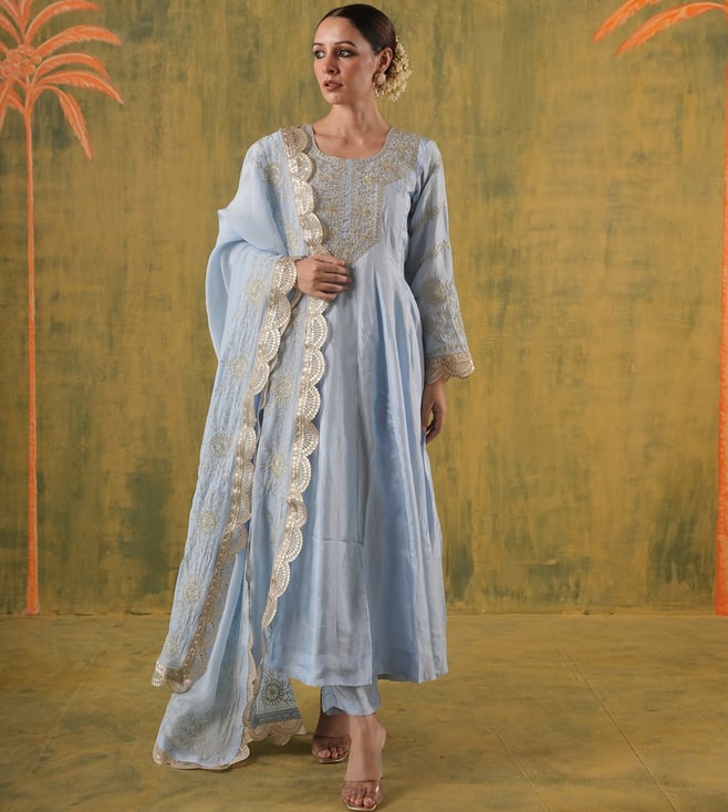 Onewe Blue Silk Relaxed Fit Embroidered Anarkali Set