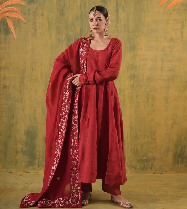 Onewe Maroon Silk Relaxed Fit Embroidered Anarkali