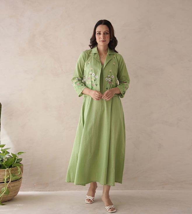 Onewe Green Silk Relaxed Fit Embroidered Kurta Set