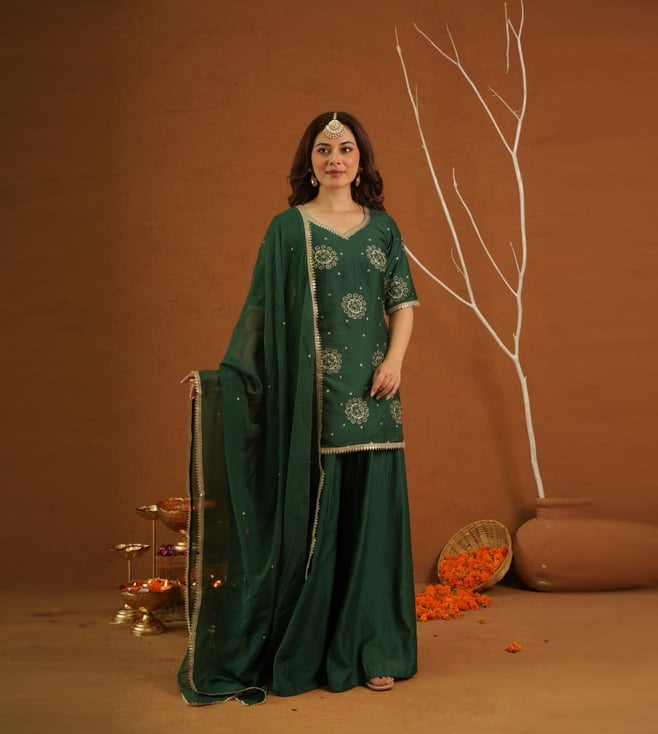 Green Muslin Embroidered Kurti With Sharara And Dupatta Set