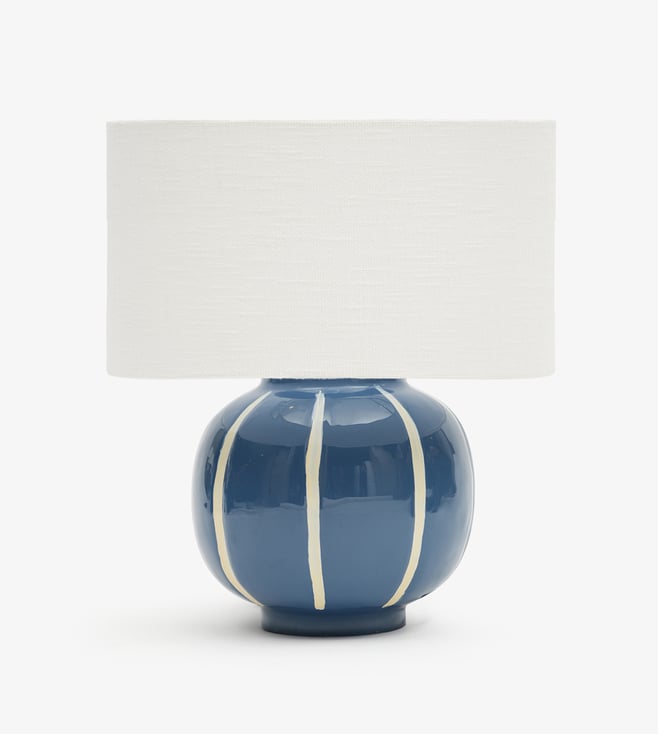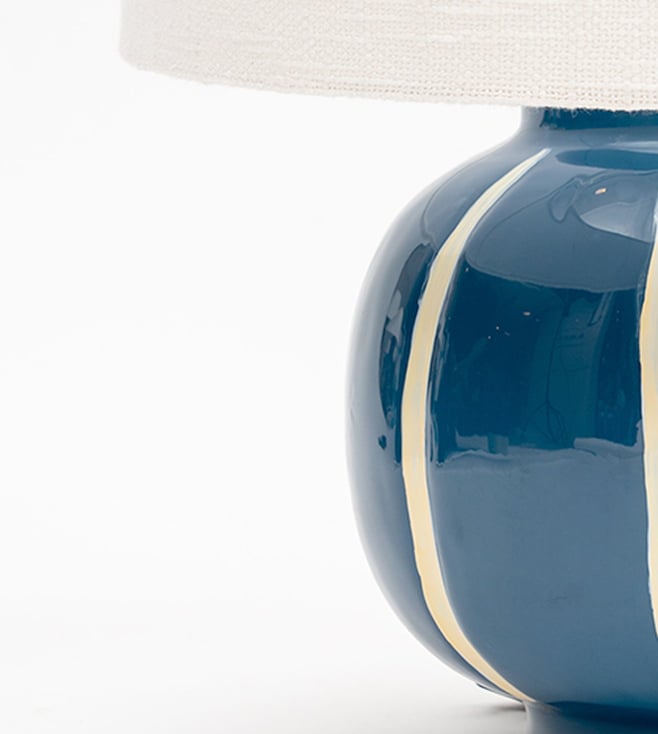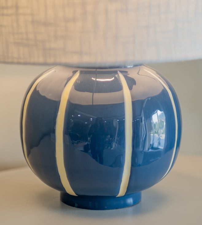 Taoza Blue brings serene elegance with its round deep indigo base and fine ivory shade. Handcrafted and grounded in symmetry, it lends timeless style to bedrooms or accent tables.