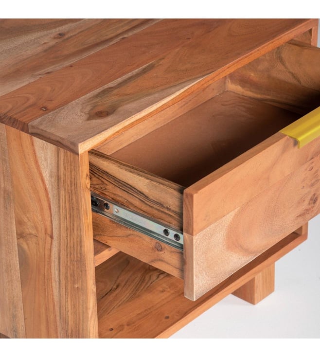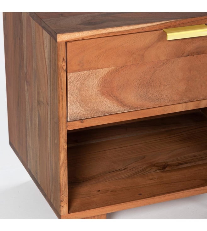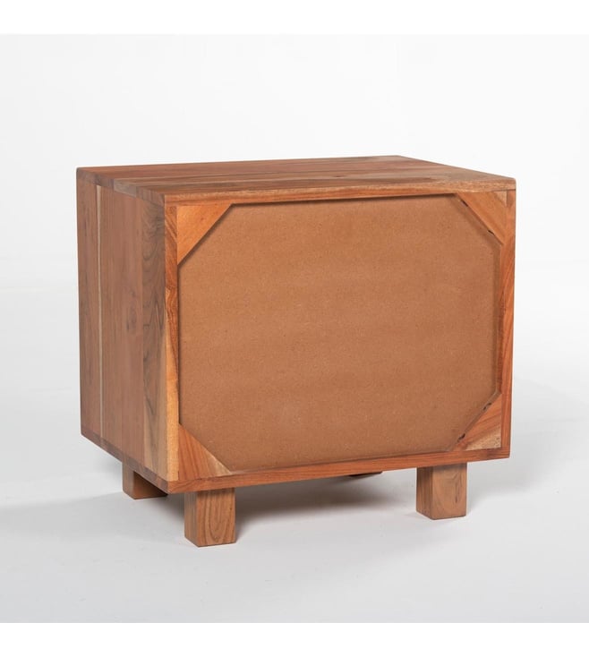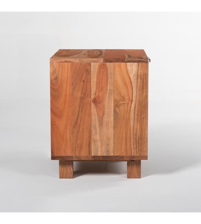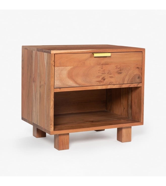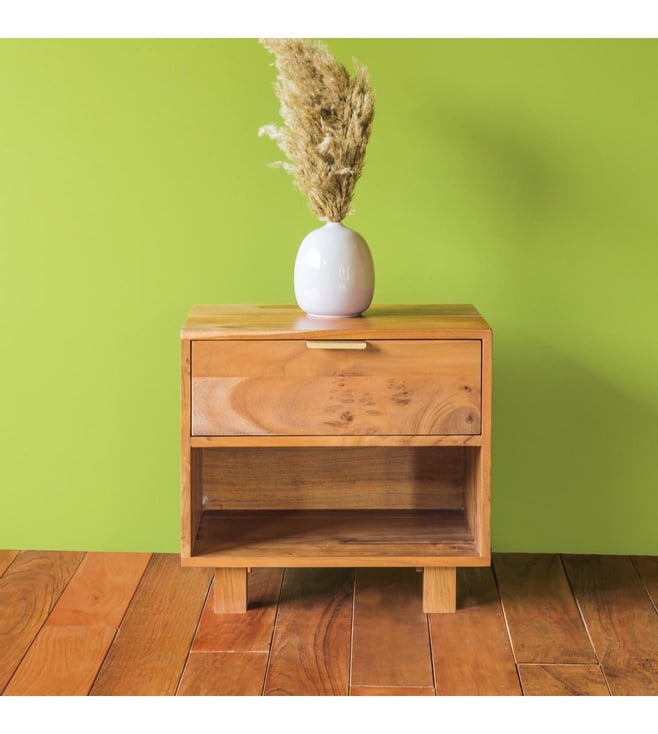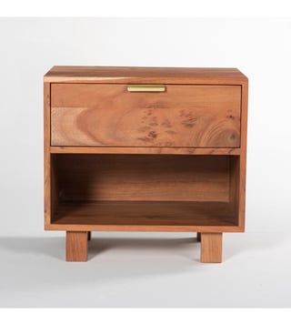 Kyoto a city in central Japan, a famous cultural centre, known for its bamboo forests, inspired this bedside table which defines natural minimalism. It takes the traditional mid-century pairing for a statement-making spin. Set within a linear frame, it shapes the frames in a natural finish. It has a drawer in the front for all of your necessities. It is crafted using acacia wood. Disclaimer: All other items in the image are only for display purposes and will not be a part of the delivery content. Product colour may slightly vary due to photographic lighting sources. Country of Origin - India.