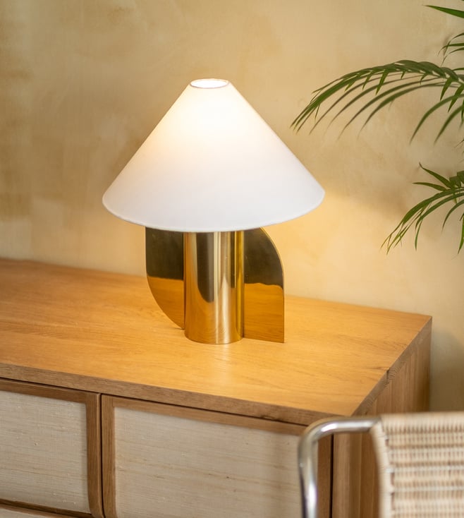 Inspired by the sun, the Helia Gold Table Lamp features a bold brass-toned body with clean geometric lines. A striking accent for desks or nightstands, it blends modern form with radiant warmth.