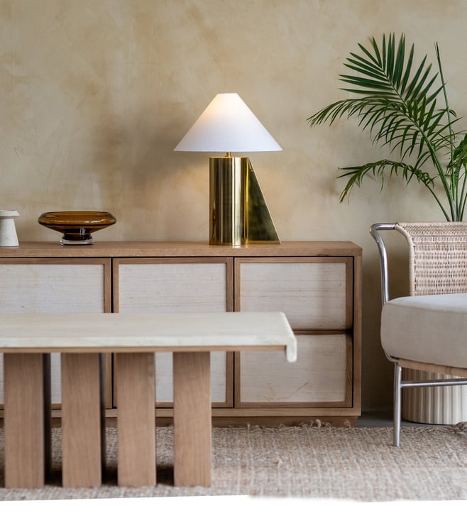 Commanding yet refined, the tall Helia lamp in luminous brass is perfect for anchoring spaces. With architectural lines and sun-inspired elegance, it enhances consoles, sofas, or bedroom corners.
