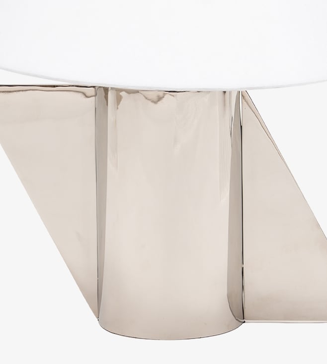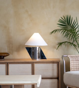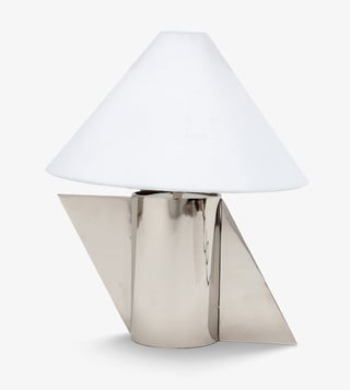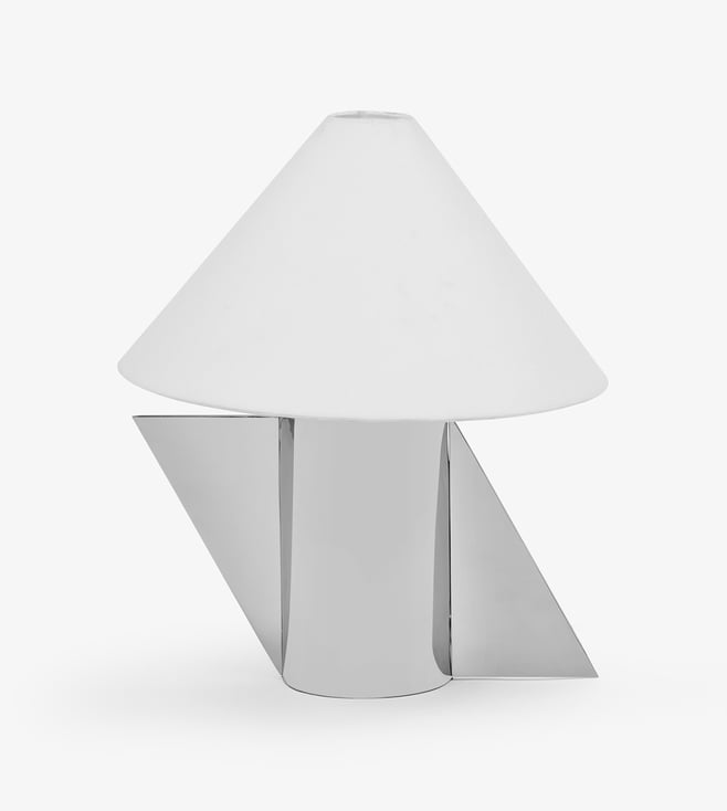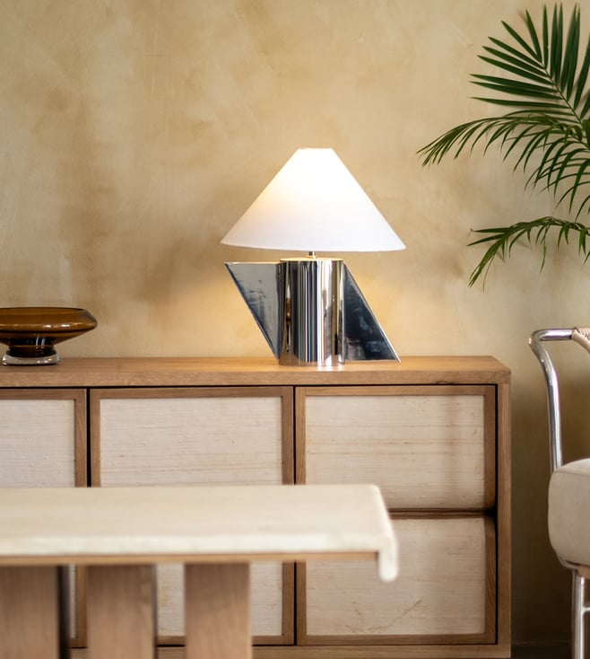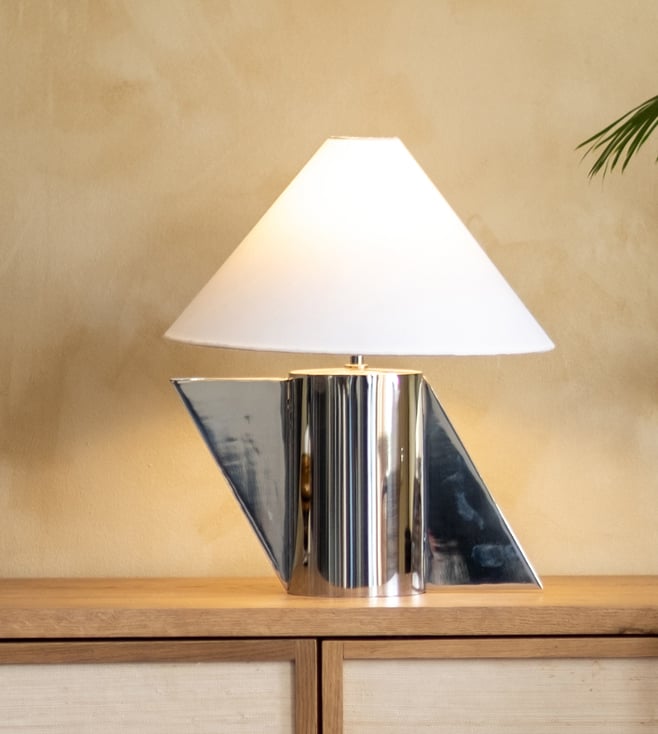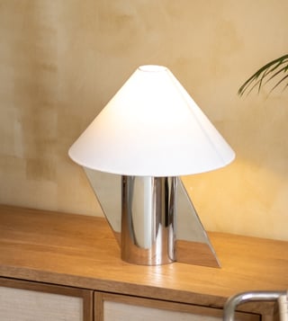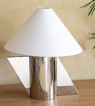 Boldly asymmetrical, the Helia Tilt Lamp plays with balance and angles. The clean silver base and white fabric shade create a modern statement perfect for workspaces or statement nooks.