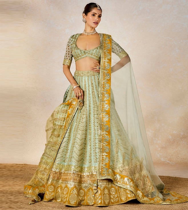 Sage Green, Baingani And Gulabi Gulaal Johari Bazaar Johri Skirt Set With Waist Coat And Dupatta