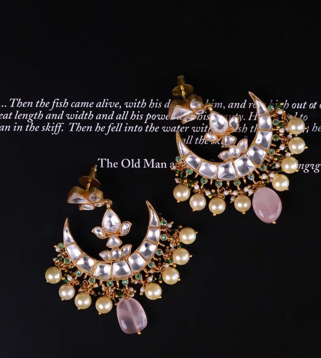 Curate a graceful look by wearing this pair of earrings from the Rangrez collection. It is handcrafted in 92.5 silver which is sure to impress you. It is finished in 22 kt gold plating with semi-precious polki, pearls, rose quartz and gemstone setting. It vaunts an attractive design which makes it a captivating pick.