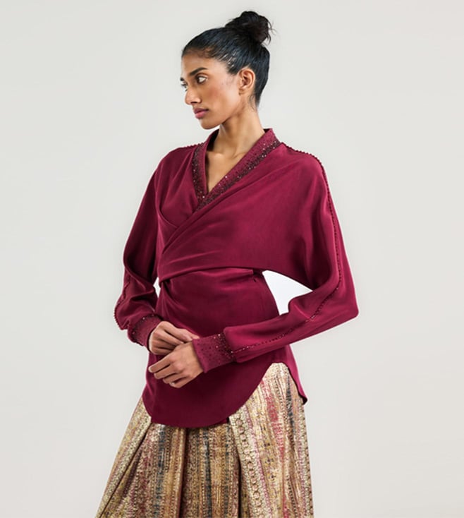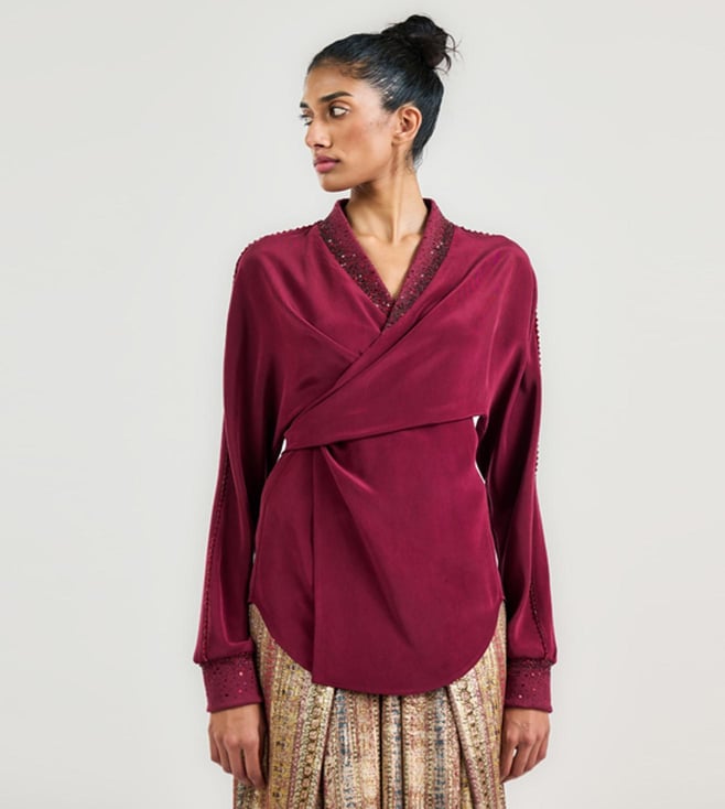 Burgundy Crape Regular Fit The Cocktail Wrap Top