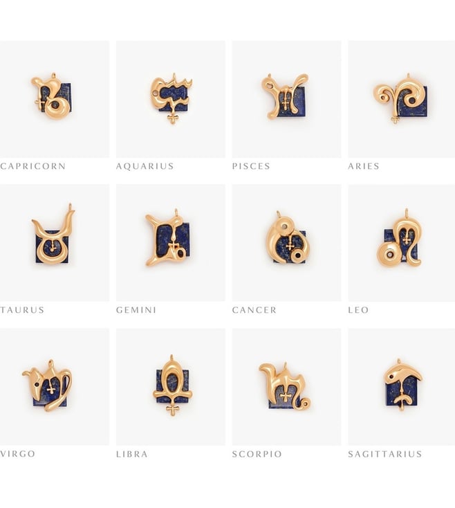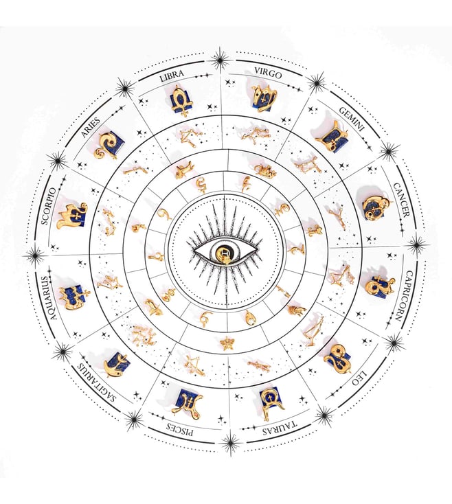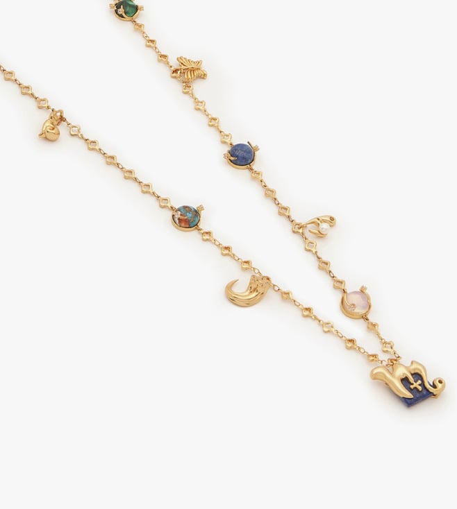 This brass necklace celebrates the alluring accents of the yesteryears, reinterpreted with a chic, contemporary edge. The zodiac motif, set in the semi-precious lapis lazuli forms the heart of your piece. It is accentuated with semi-precious stones such as malachite, white opal and American turquoise, sparkling cubic zirconia.