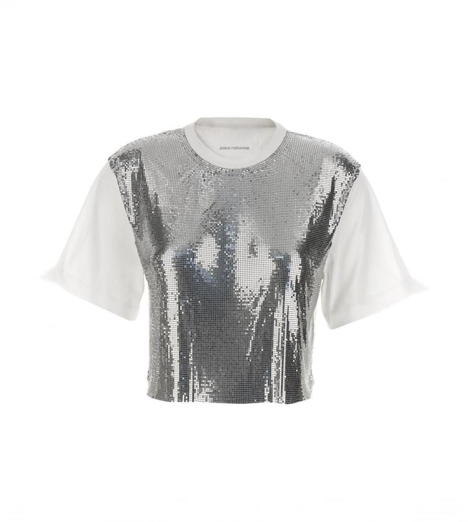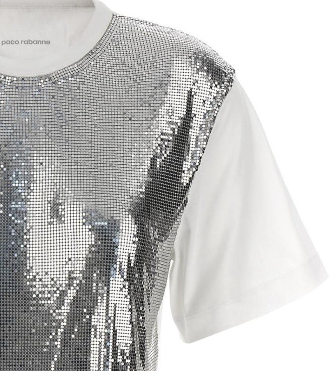 Unleash your inner futurist with the Paco Rabanne Silver Metal Mesh T-Shirt, a dazzling masterpiece in metallic allure. This regular fit creation shimmers with every movement, crafted from 100% aluminum fabric that drapes like liquid silver. Its intricate mesh pattern captures light, creating a mesmerizing dance of reflections. Designed for the bold and the brave, this avant-garde piece features a seamless closure, offering a sleek silhouette. Perfect for the modern woman ready to make a statement.