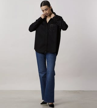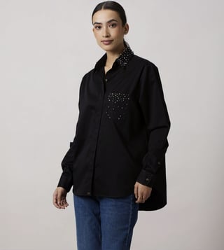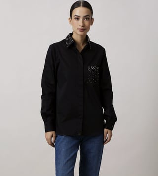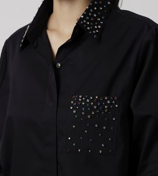 Introducing the cotton satin black multicolor swarovski studs full sleeve shirt. This statement piece exudes sophistication and flair with multicolored swarovski studs adorning the sleeves. Crafted from premium cotton satin, it ensures both style and comfort. Elevate your wardrobe with this bold yet elegant shirt, perfect for making a chic statement on any occasion. Disclaimer: Product colour may slightly vary due to photographic lighting sources. Country of Origin - India.