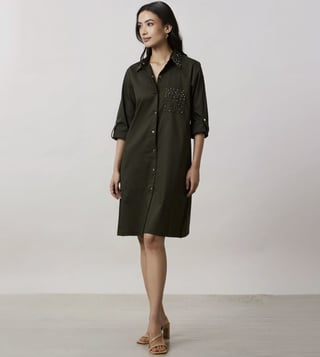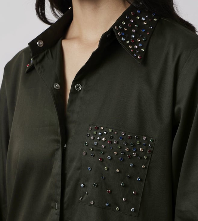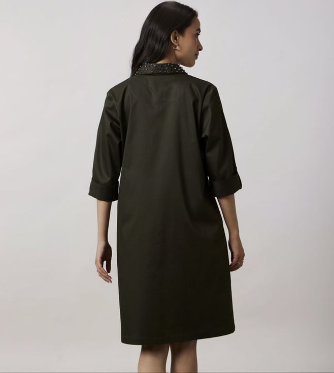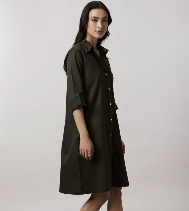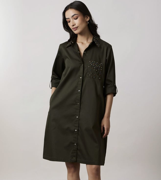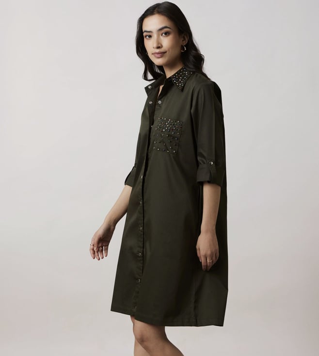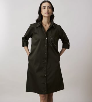 Pallavi Swadi Olive Collar Pocket Swarovski Stud Shirt Dress