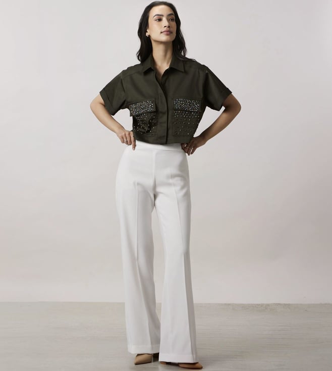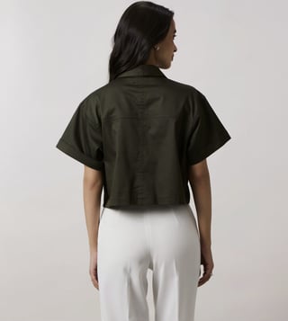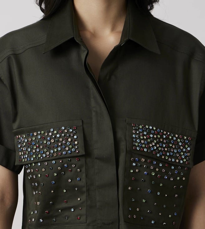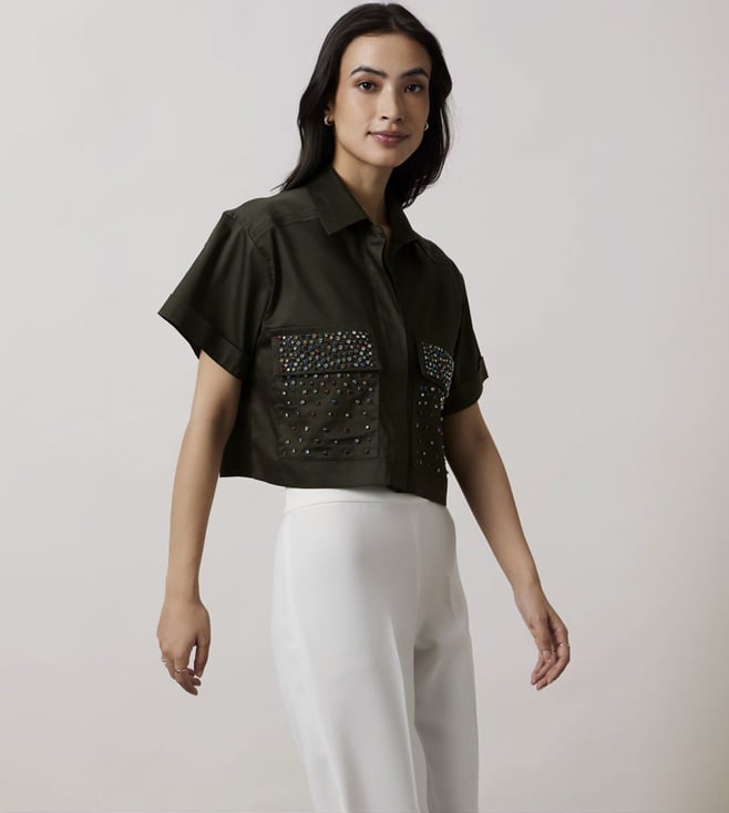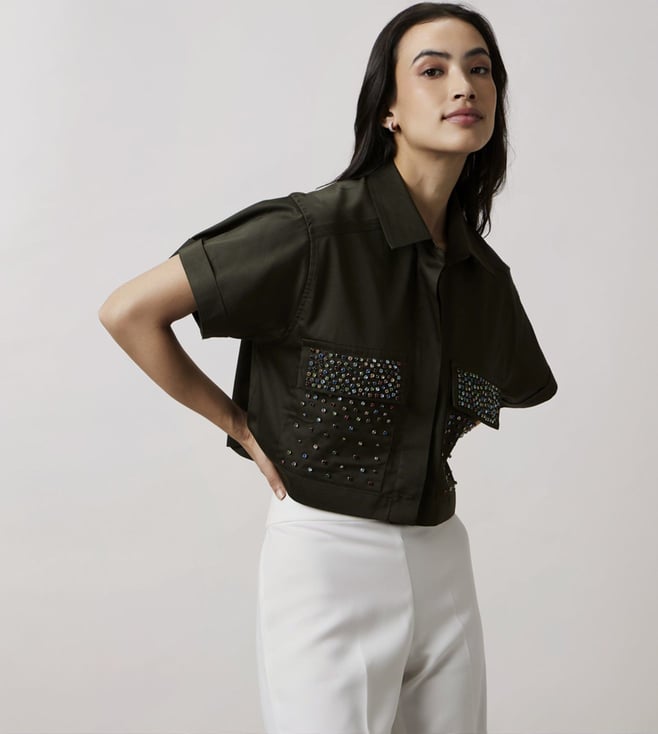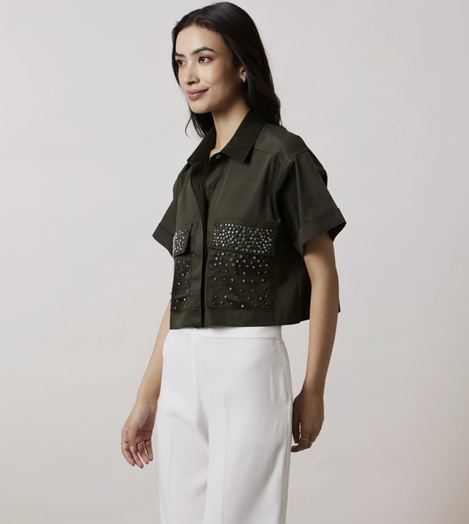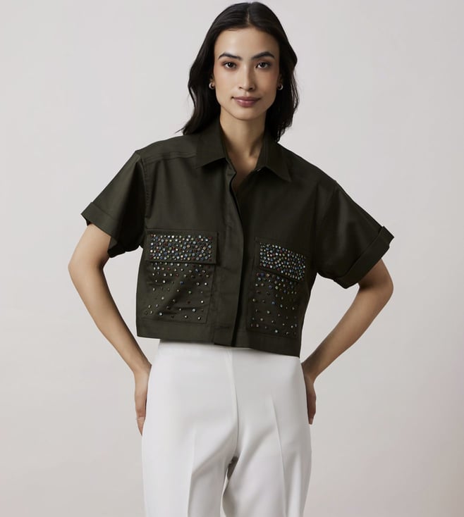 Pallavi Swadi Olive Crop Shirt with Multicolour Swarovski Studs
