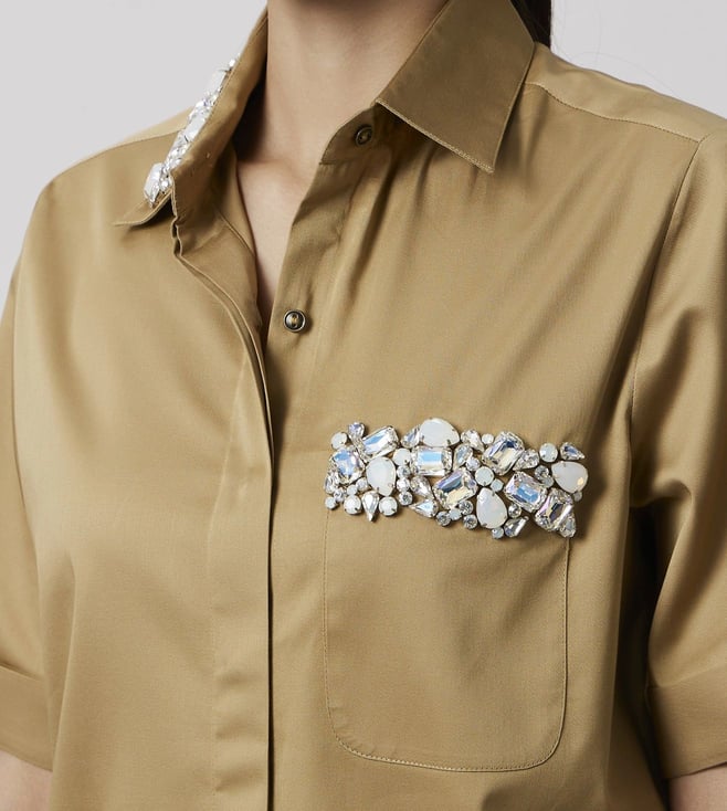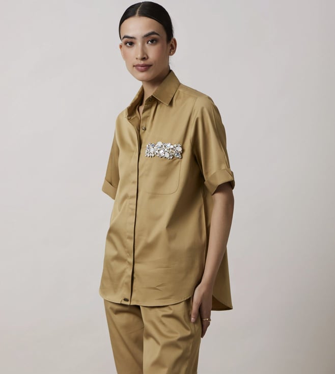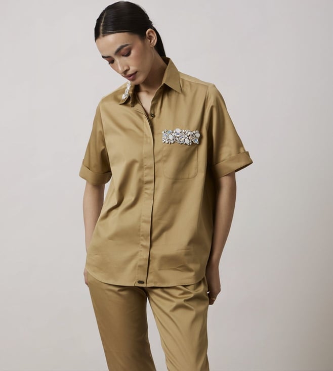 Pallavi Swadi Sand Collar Pocket Swarovski Shirt with Pant Co-ord Set