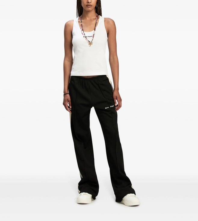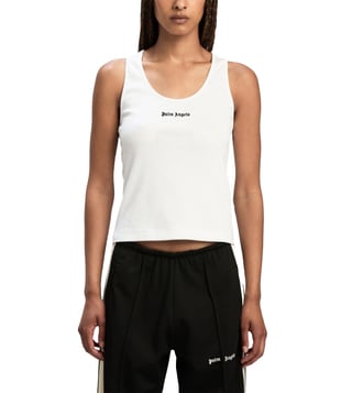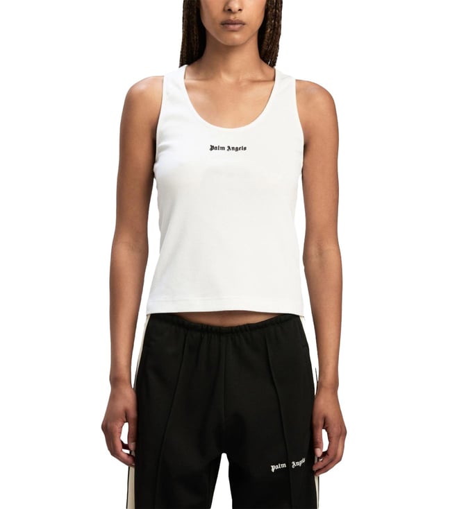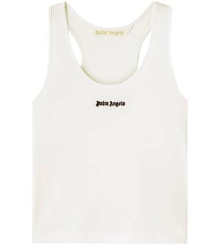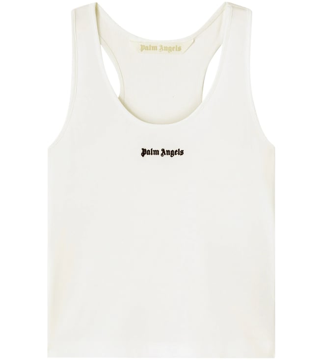 The Palm Angels White Logo-Embroidered Ribbed Tank Top is a chic blend of comfort and style, crafted for the modern woman. This regular fit tank top, in a pristine white hue, features a subtle yet striking logo embroidery that adds a touch of luxury. Made from a soft and stretchy blend of 93% cotton and 7% elastane, it offers a flattering silhouette and all-day comfort. The ribbed pattern enhances its texture, making it a versatile piece for any wardrobe. Ideal for layering or wearing solo, it's a must-have staple.