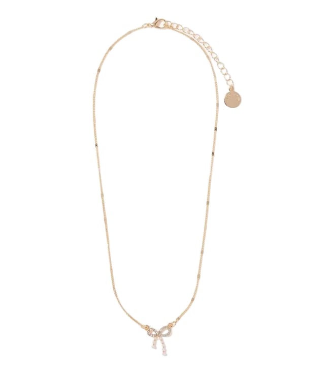 Elevate your look with the pat pretty bow necklace from Forever New. This stunning statement piece features a detailed bow design adorned with shimmering crystals and pearls, set in a luxurious gold tone setting. The lobster fastening ensures a secure fit, making it the perfect addition to any outfit. Add a touch of elegance and charm to your ensemble with this timeless and versatile necklace.
