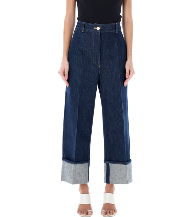 Elevate your wardrobe with the Patou Indigo Regular Fit Jeans. Designed with denim trousers by patou. featuring:, regular waist, gold-tone button and zip closure, constrast stitching, two side pockets, belt loops, darts at back, bold cuffs, straight wide leg, these trousers combine comfort and sophistication for everyday wear. Products purchased from Darveys are supported exclusively by the warranty/exchange policies of Darveys and its partner boutiques. Brand owners and their channel partners are not responsible for exchange/warranty services for items purchased through Darveys.