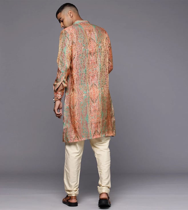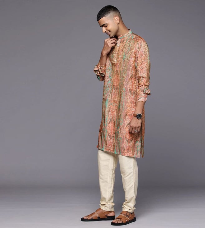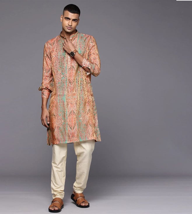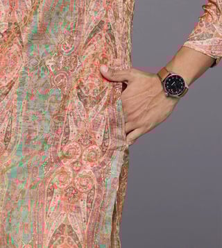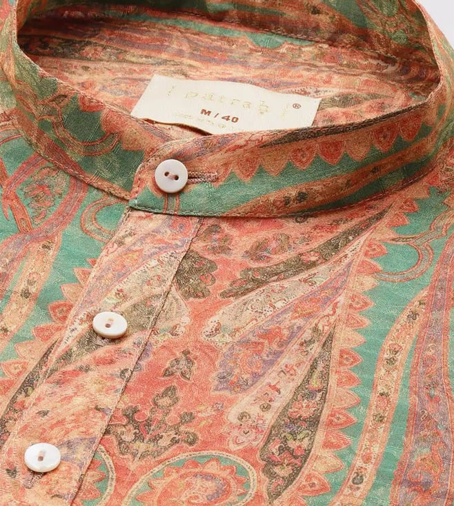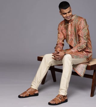 Elevate your festive wardrobe with the Patrah Peach Silk Relaxed Fit Printed Kurta for men. This long-sleeve design offers comfort and style in luxurious silk. Disclaimer: All other items in the image are only for display purposes and will not be a part of the delivery content. Product colour may slightly vary due to photographic lighting sources. Country of Origin - India.