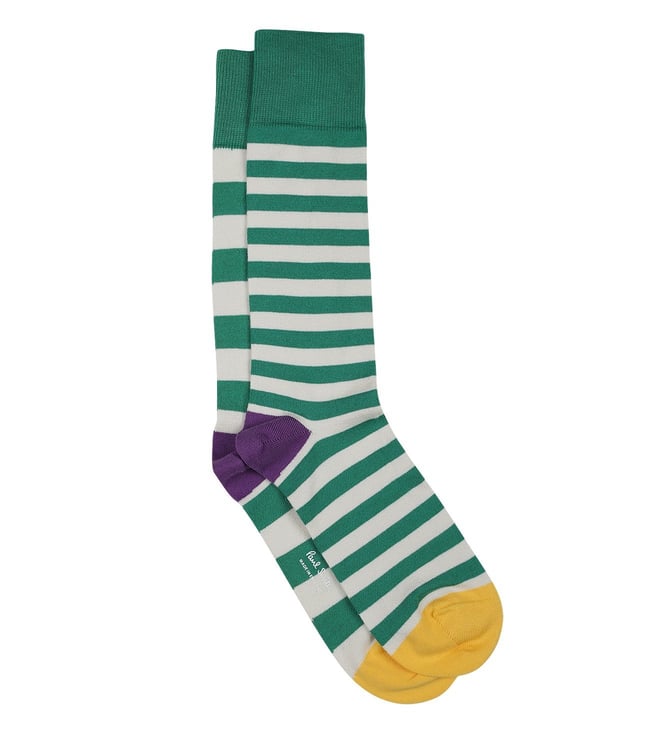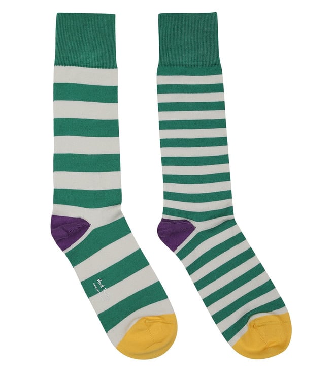 Pep up your look with these socks from Paul Smith. Crafted with care from superior quality fabric, these will be soft against your skin. These men's odd socks features a large cream and Breen stripe and a contrasting yellow and purled heel and toe.