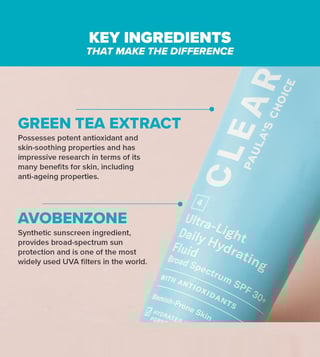 Water, Octinoxate, Glycerin, Octisalate, Silica, Octocrylene, Avobenzone, Dimethicone, Tocopherol, Chamomilla Recutita (Matricaria) Flower Extract , Vitis Vinifera (Grape) Seed Extract, Camellia Sinensis Leaf Extract, Camellia Oleifera (Green Tea) Leaf Extract, Peucedanum Graveolens (Dill) Extract, Sambucus Nigra Fruit Extract, Oat Bran Extract, Punica Granatum Fruit Extract, Lycium Barbarum Fruit Extract, Hydrogenated Lecithin, Titanium Dioxide, Dimethicone/Vinyl Dimethicone Crosspolymer, Diethylhexyl Syringylidenemalonate, Hydroxyethyl Acrylate/Sodium Acryloyldimethyl Taurate Copolymer, Xanthan Gum, Sodium Carbomer, Benzyl Alcohol, Sodium Benzoate. Potassium Sorbate. Phenoxyethanol.