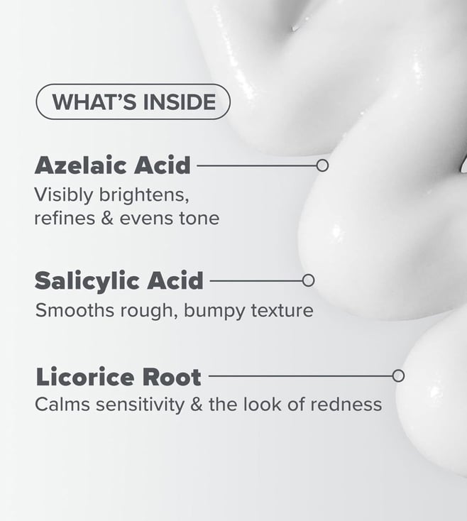 Water, Azelaic Acid. C12-15 Alkyl Benzoate. Caprylic/Capric Triglyceride, Methyl Glucose Sesquistearate, Glycerin, Cetearyl Alcohol, Glyceryl Stearate, Dimethicone, Salicylic Acid. Adenosine, Glycyrrhiza Glabra (Licorice) Root Extract, Boerhavia Diffusa Root Extract, Allantoin, Bisabolol, Cyclopentasiloxane, Xanthan Gum, Sclerotium Gum, Propanediol, Butylene Glycol. Phenoxyethanol.