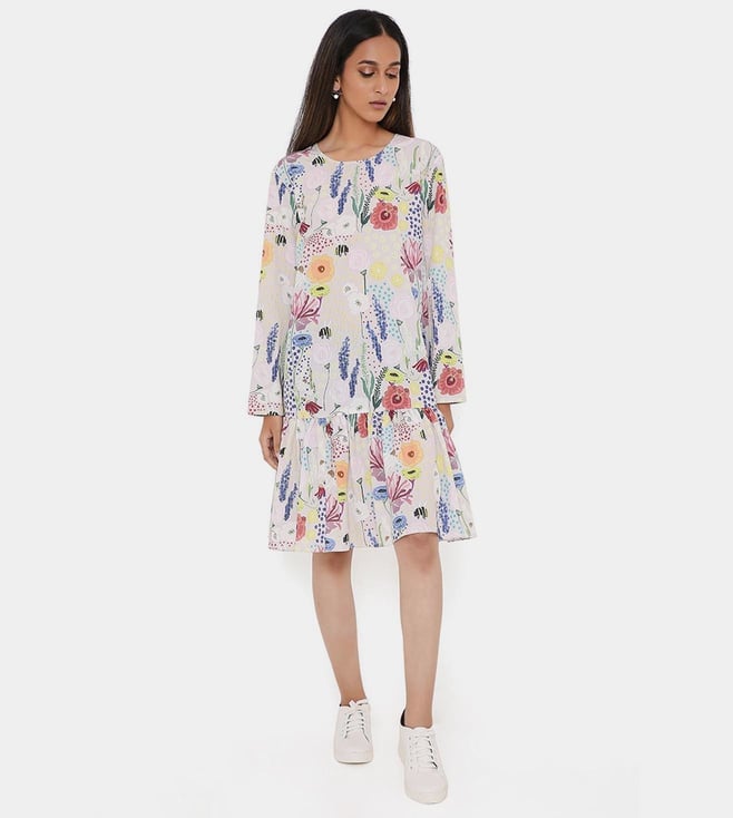 Cream Spring Floral Garden Print Art Crepe Frill Hem Tunic