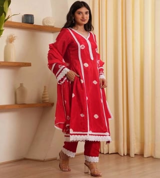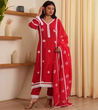 Channel a winning style by wearing this bandhani suit set. It is crafted with care using silk. Disclaimer: Product colour may slightly vary due to photographic lighting sources. Country of Origin - India.