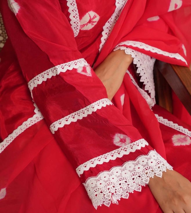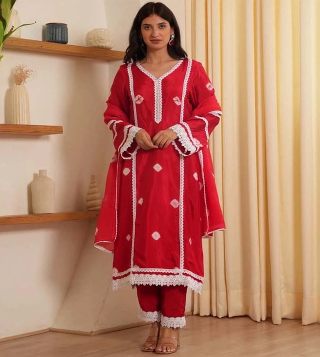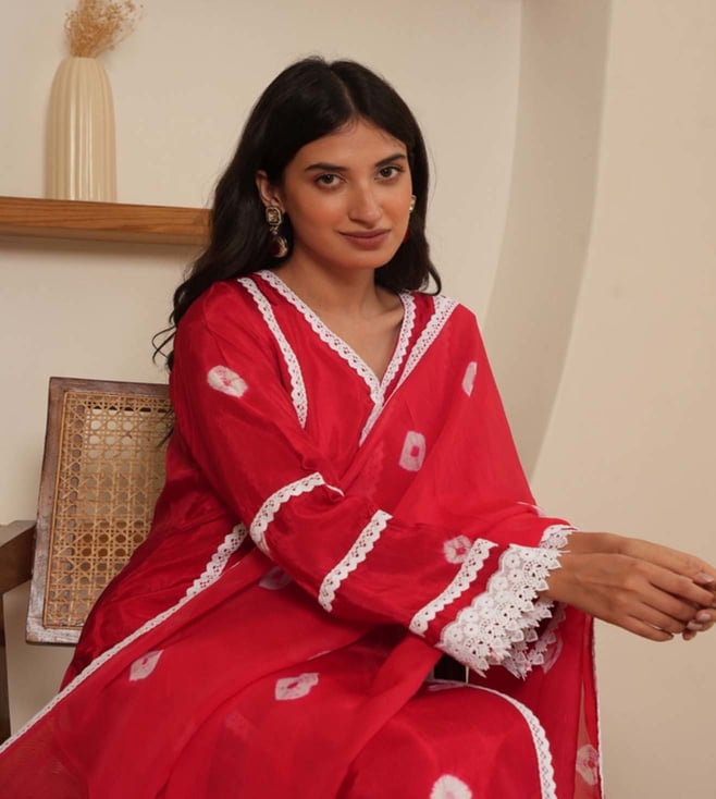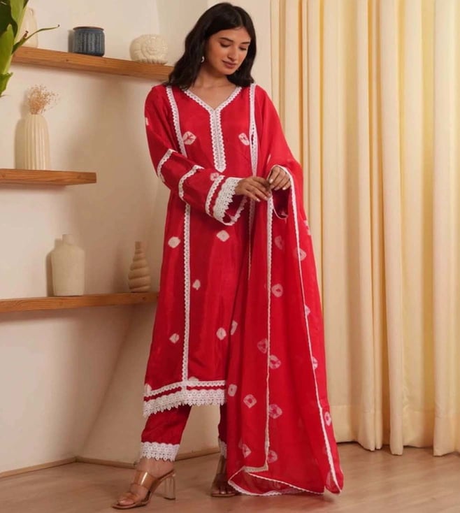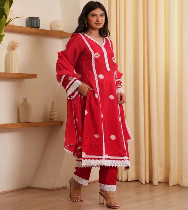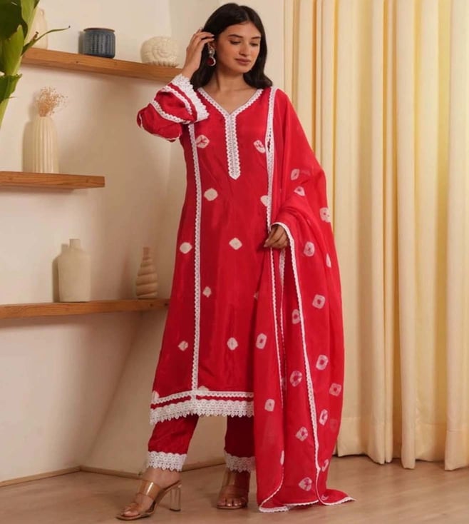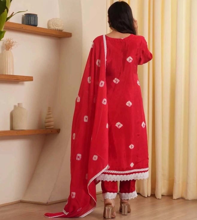Pehnosa Zuri Red Bandhan Bandhani Silk Suit Set Kurta With Pant And Dupatta