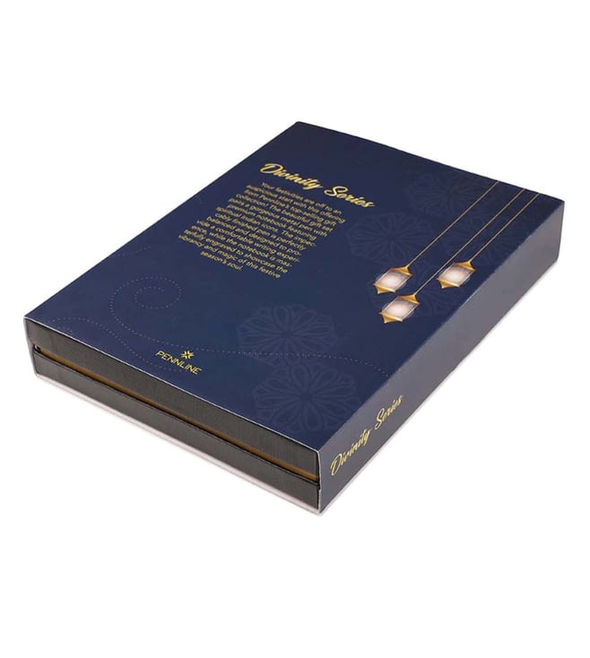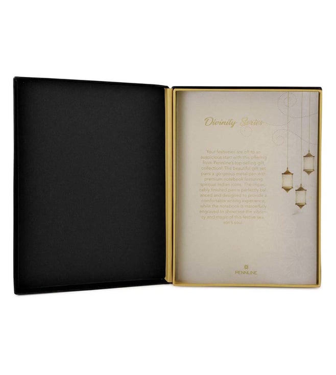 Presenting a gorgeous metal pen with a premium notebook featuring spiritual Indian icons that gets your festivities to an auspicious start. The laser engraved pen features deity on its barrel and has a smooth refill that writes effortlessly. Expandable inner back utility pouch with color coordinated elastic band and satin tape bookmark is also provided. The impeccably finished pen and notebook is set in an exclusive gift box which makes a perfect gift for your loved ones. Dimension - Width (13) cm, Height (2) cm, Length (21) cm.