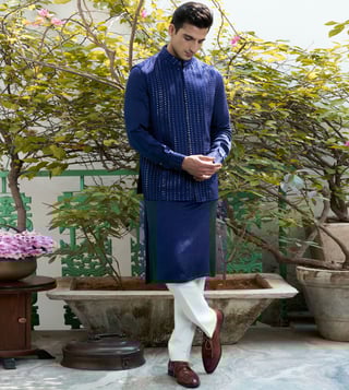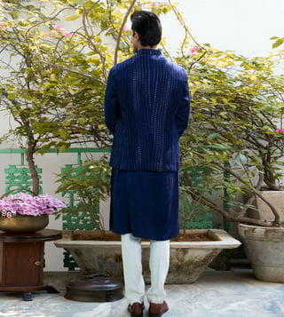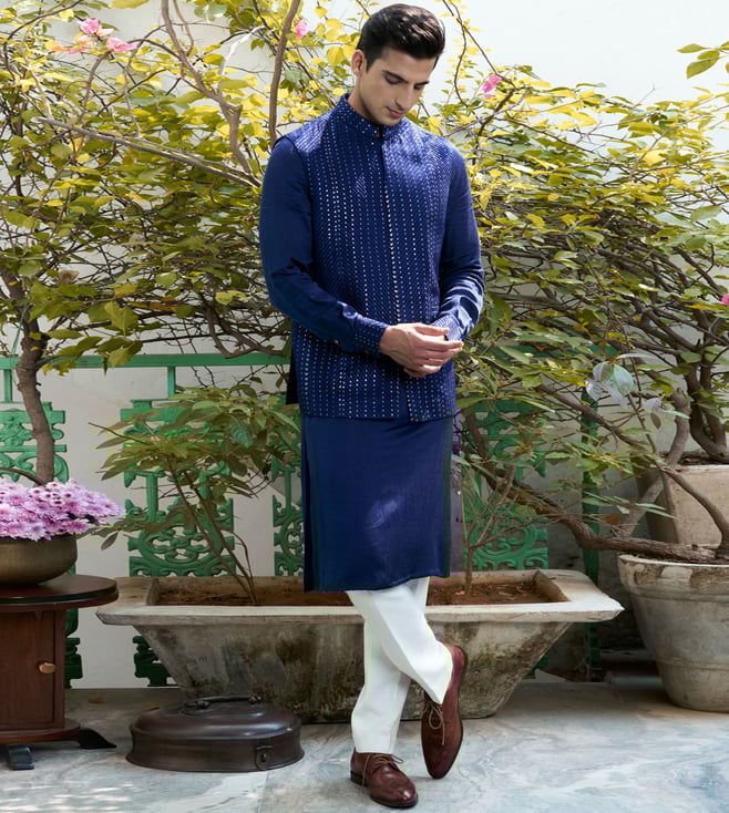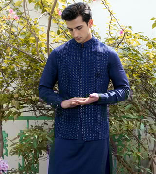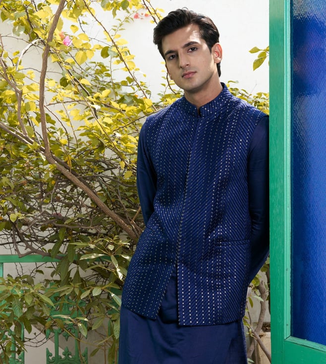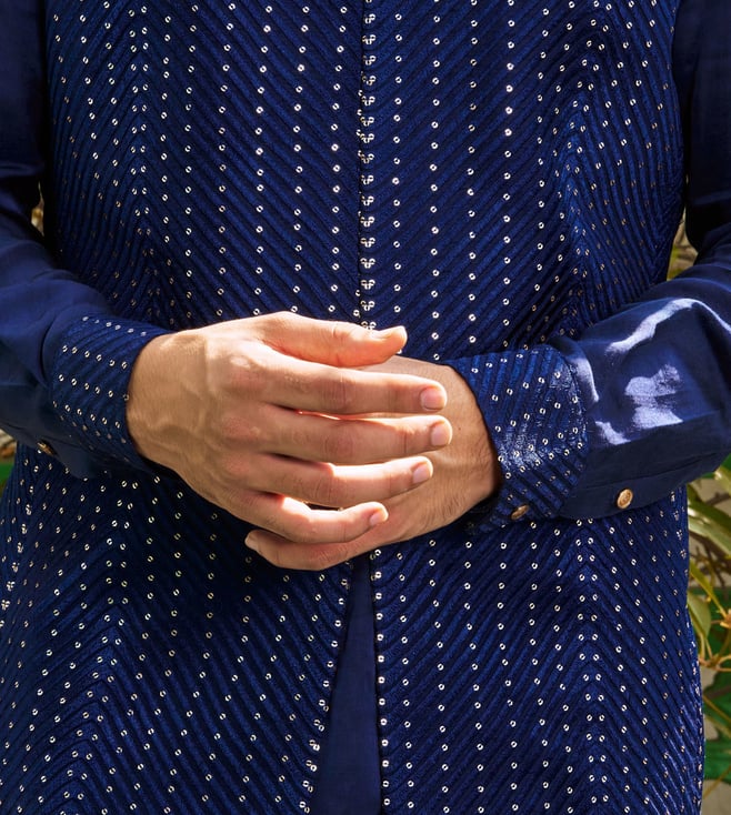 Elevate your festive wardrobe with this navy blue embroidered cotton silk bandi by Philocaly. It features full sleeves and intricate sequin detailing for a stylish touch. Disclaimer: All other items in the image are only for display purposes and will not be a part of the delivery content. Product colour may slightly vary due to photographic lighting sources. Country of Origin - India.