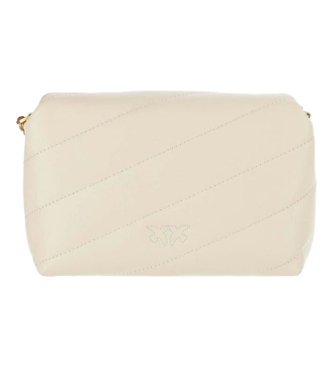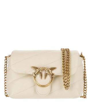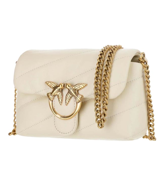 Bag made of soft nappa leather maxi slanted quilting front flap and concealed button closure love birds diamond cut logo buckle on front antique gold-tone metal finish chain shoulder strap microfiber lined interior white.
