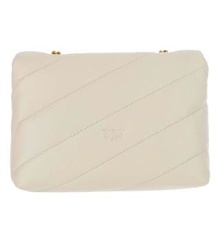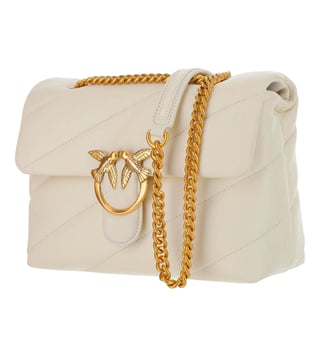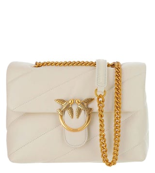 Bag made of soft nappa leather quilted design flap and button closure love birds diamond cut buckle on front chain shoulder strap with leather shoulder strap antique gold color metal finish two interior compartments with center zipper.