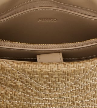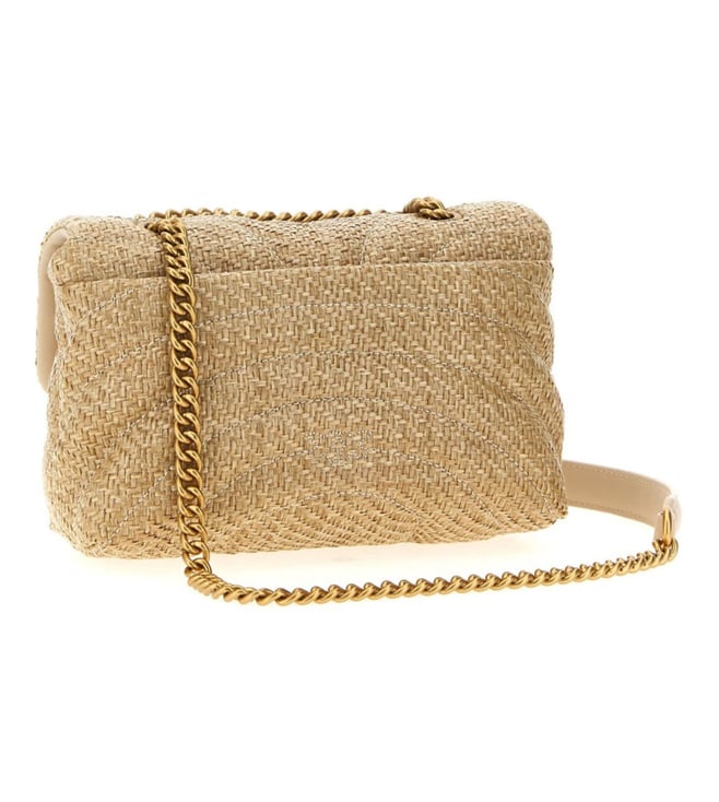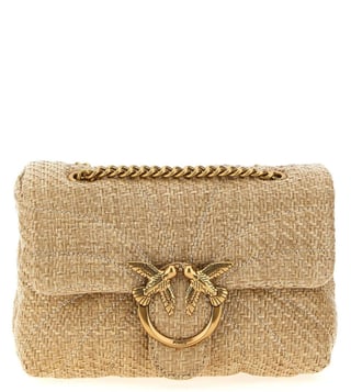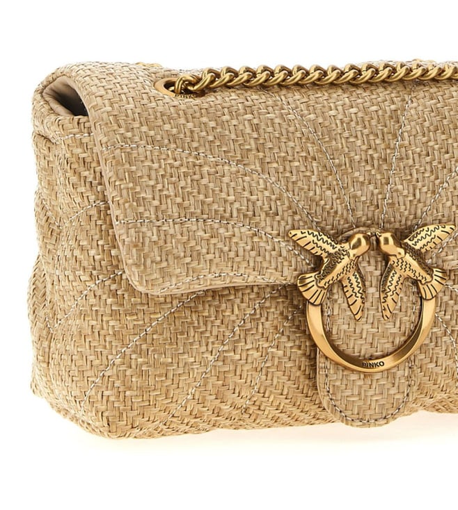 Beige mini love bag puff raffia crossbody bag with butterfly quilting, interlocking flap closure with gold metal love birds diamond cut buckle, back pocket, chain shoulder strap with sliding leather protection.