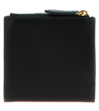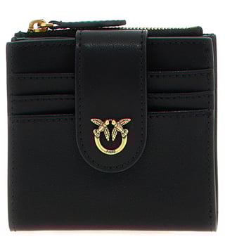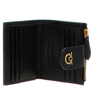Multi purpose leather wallet, button closure with metal logo appliqu, zip closure and card holder. w 10 x h 9 x d 1.5 cm