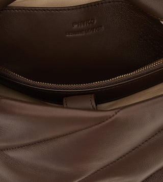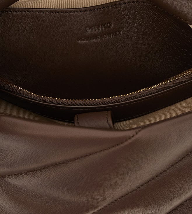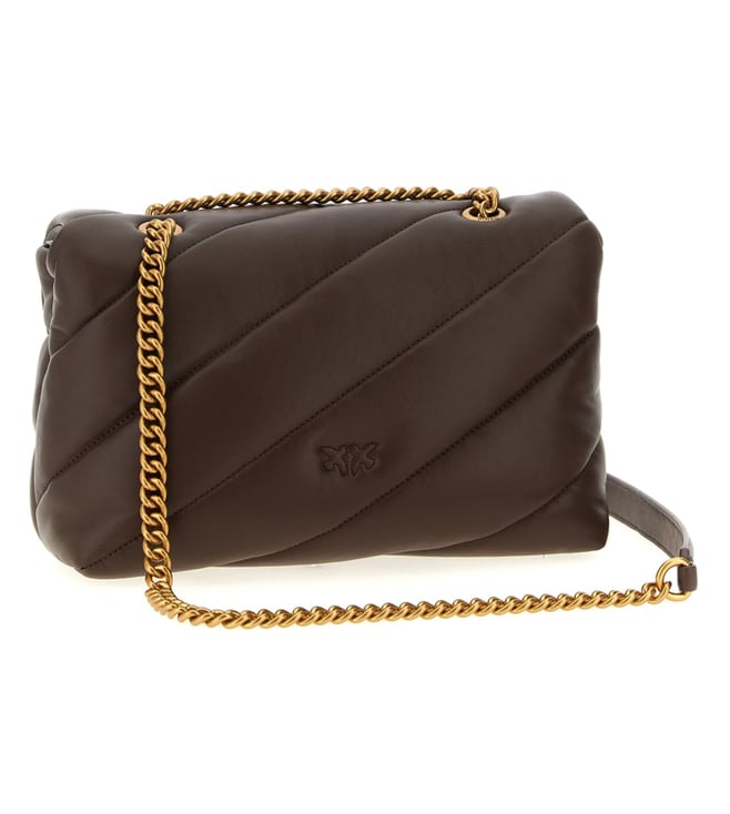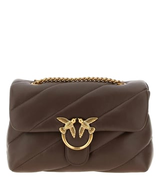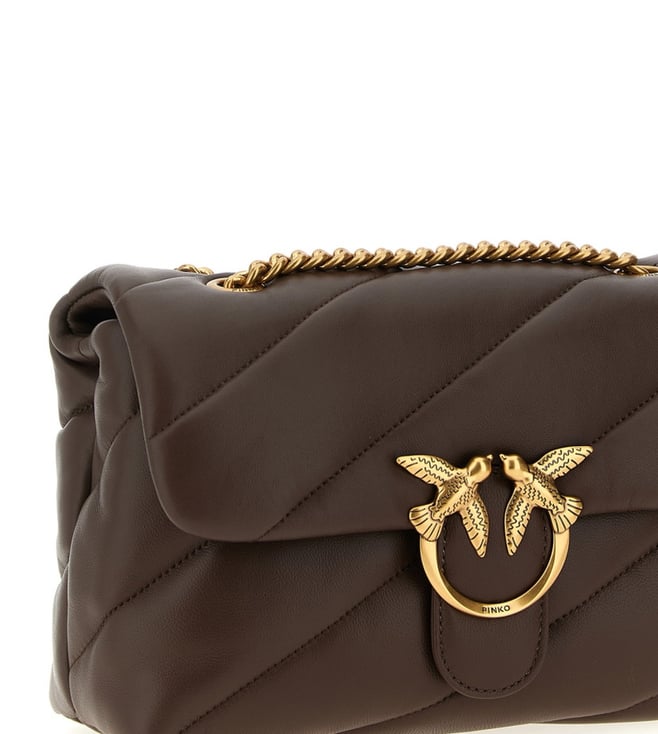 Expand the collection of your accessories in a trendy way with this bag from Pinko. Brown classic love bag puff quilted leather crossbody bag with flap closure, front metal logo, chain to be carried over the shoulder.