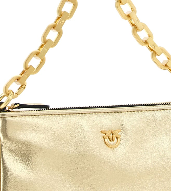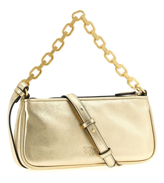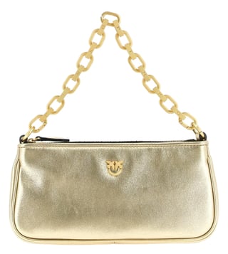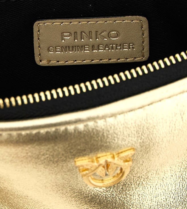 Golden half Moon Baguette Mini bag In Silk Hand-held Leather, Metal love Birds Diamond Cut Plaque On The Front, Top Zip Closure, 1 compartment, textured, Adjustable Shoulder Strap. With its timeless design and practical features, this bag is a must-have accessory for the modern woman on-the-go.