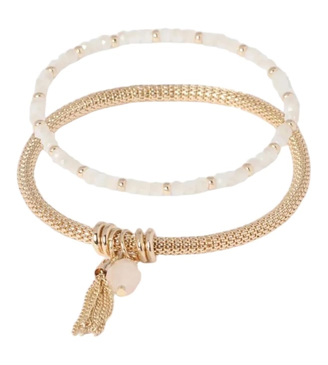 Elevate your wrist game with the pippa bracelet pack from Forever New. This elegant set features a mix of chain and beaded designs adorned with a stone charm and gold tone tassel, all set in a luxurious gold tone setting. The stretch fit style ensures effortless wear, allowing you to layer your wrist with sophistication and style. Perfect for adding a touch of glamour to any outfit, this bracelet pack is a must have accessory for those who love to make a statement.